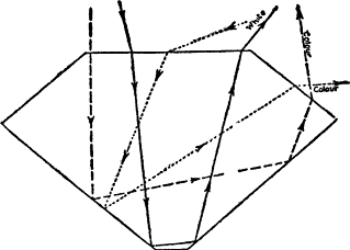 Explanation of Double Refraction. In Lesson II. we learned what is meant by refraction of light. While glass and a small number of precious stones (diamond, garnet, and spinel) bend light as was illustrated in Fig. 1, practically all the other stones cause a beam of light on entering them to separate, and the path of the light in the stone becomes double, as shown in Fig. 2.