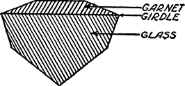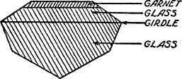 Similarly, ruby can at once be distinguished from even the finest garnet or ruby spinel, as the last two are singly refracting. So, too, are glass imitations of ruby and ruby doublets (which consist of glass and garnet). This test cannot injure the stone, it may be applied to mounted stones, and it is reliable. For stones of very deep color this test may fail for lack of sufficiently brilliant reflections. In such a case hold the card beyond the stone and let the sunlight shine through the stone onto the card, observing whether the spots of light are single or double.