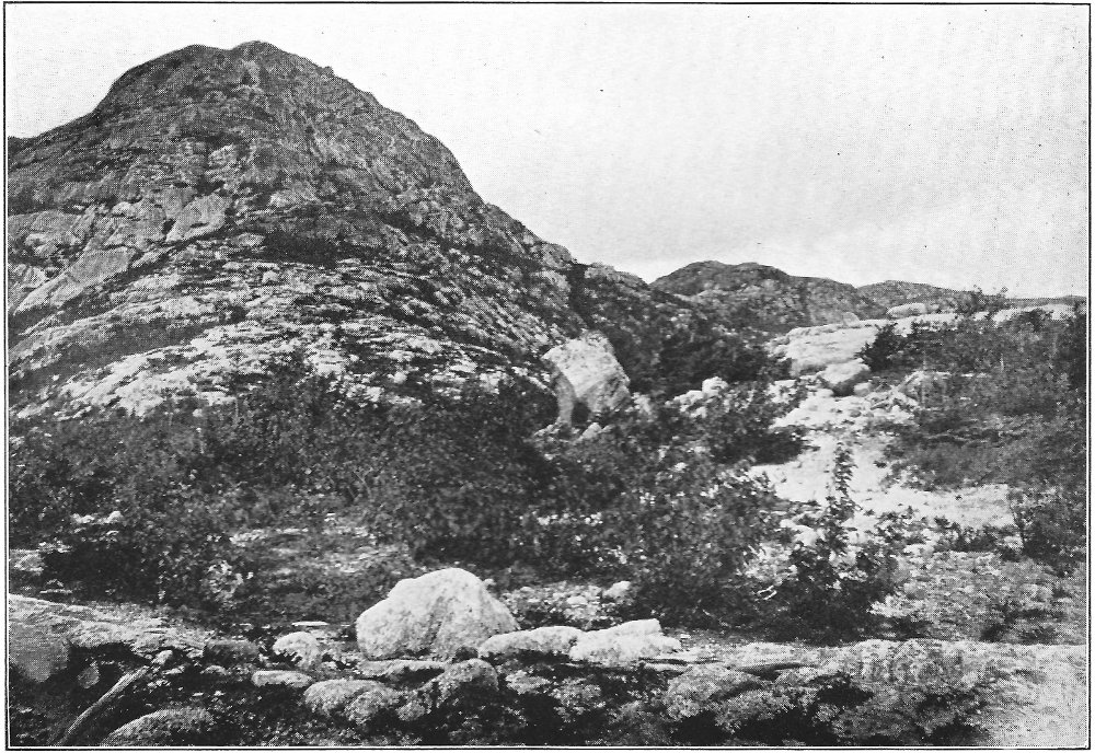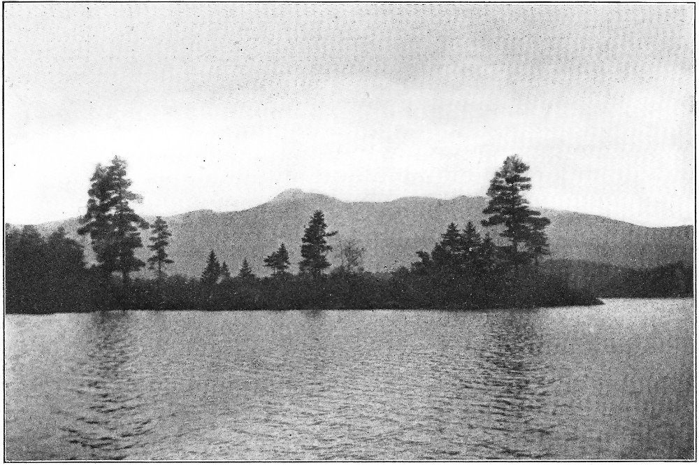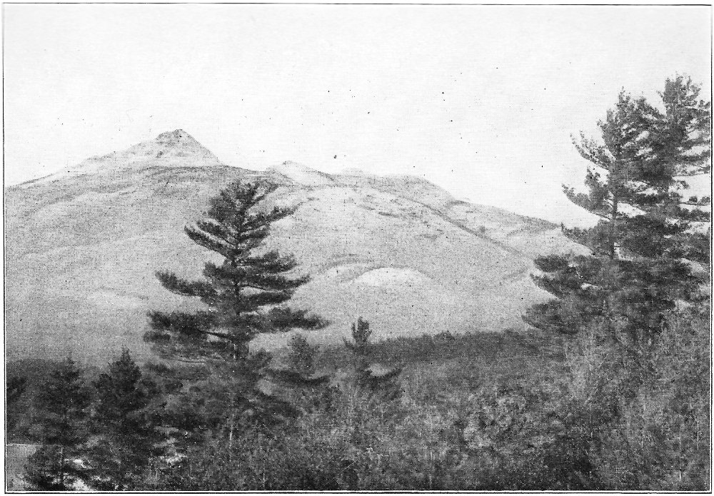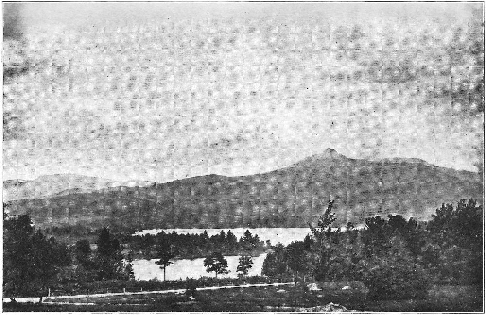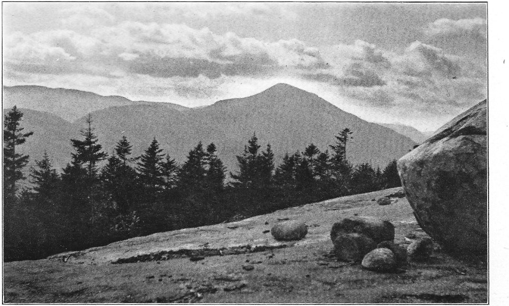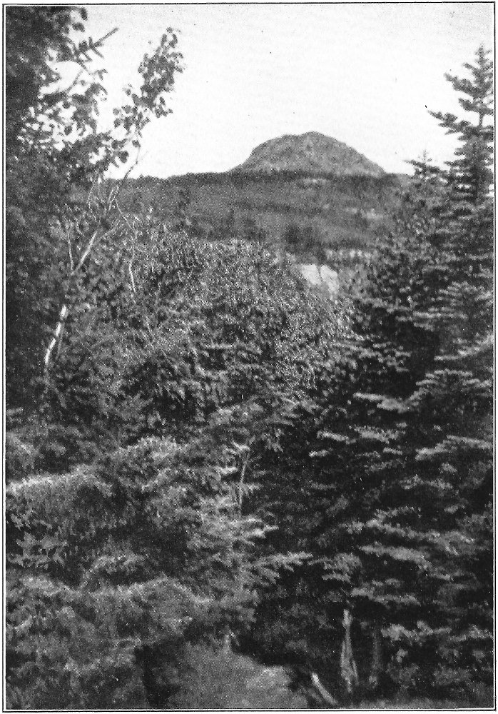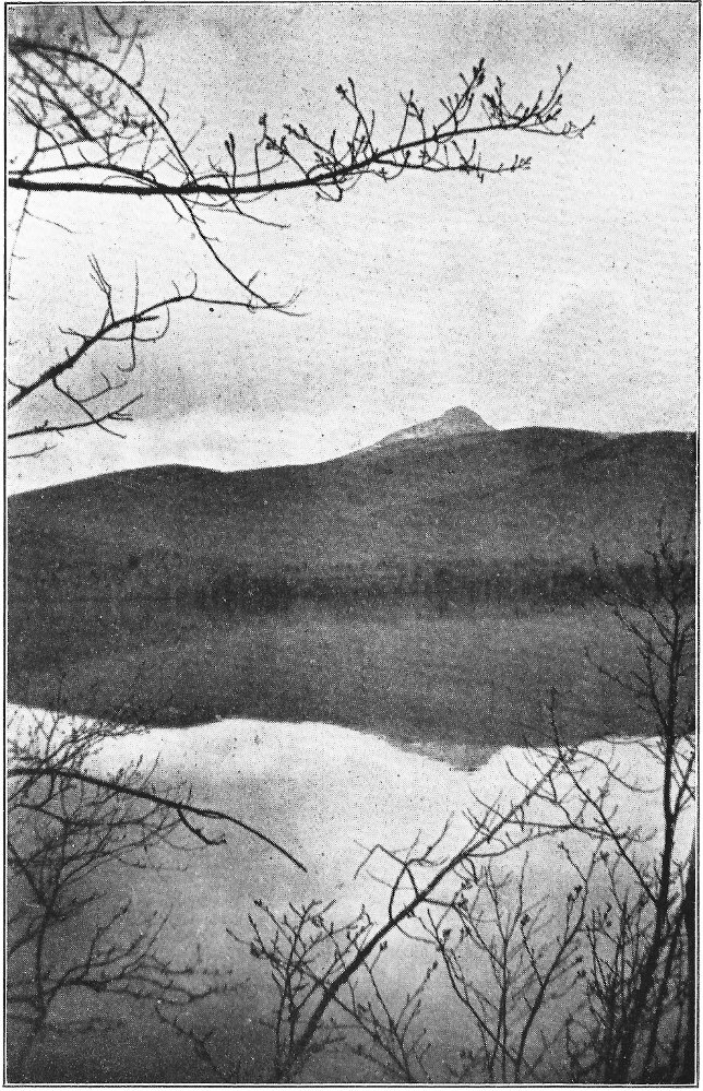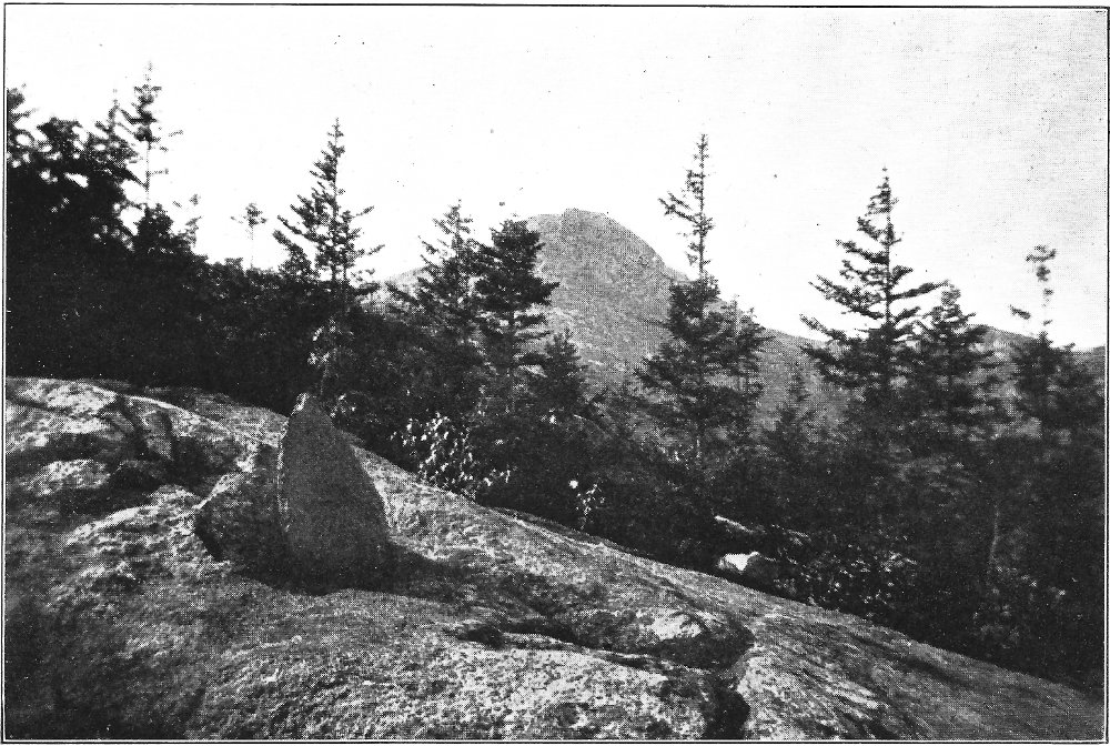 Leaving the swamp, I climbed the terrace marking the ancient border of the lake, which once included the swamp in its area, and passed through a grove of slender birches and poplars. Their stems, streaming with rain, were as bright as polished marble, and their foliage, illuminated by the clear sunlight, was marvelously green against the deep blue of the sky. Presently a vista opened northward, and at its end rose the dark peak of Chocorua. After a rain this towering rock presents a noticeably different appearance from its normal coloring. Most of its surface is covered by lichens, one species of which, when dry, resembles burnt paper. When rain falls upon these lichens they alter their tints, and the burnt paper species in particular becomes so green that a wonderful 8 change takes place in the whole coloring of the mountain. Looked upon through the birch vista, the air being clear and clean, and the colors of the mountain uncommonly bright, the peak seemed near at hand, and even grander than usual. There are few things in New England as truly picturesque as this horn of Chocorua. Three thousand feet above its lake and the level of the Saco, the great rock lifts itself with bold and naked outline into the midst of the sky. No foot seems able to creep up its precipitous slopes to its dizzy tip, and even the sturdy spruce can cling only to the deep clefts in its storm-swept ledges. There was a time when the forest reached to its crest, and when the cold rocks, now naked, were covered deep in soil and mosses. Passaconaway, close by, shows how this could have been, and how Chocorua must have looked draped in evergreens. Fire and hurricane destroyed the trees; the parched soil was washed away from the rocks; and now the only trace of the old forest growth is an occasional bleached stump or log hidden in a cleft in the ledges.