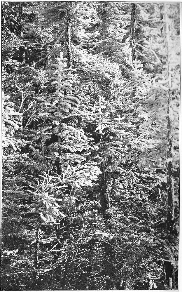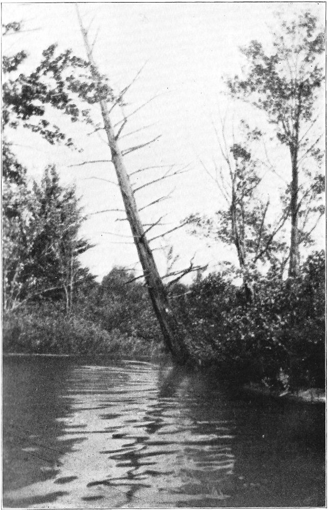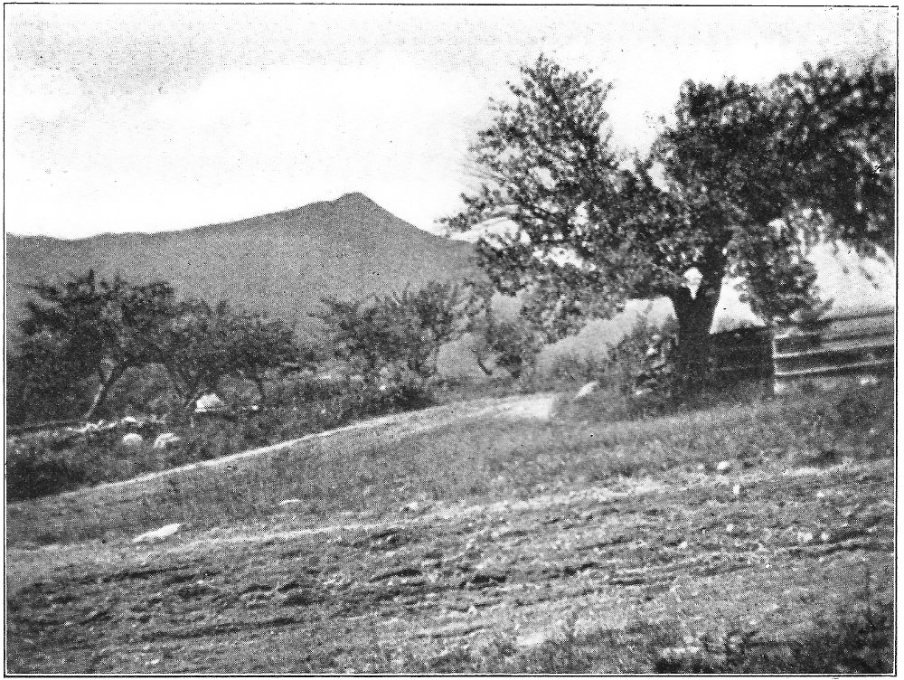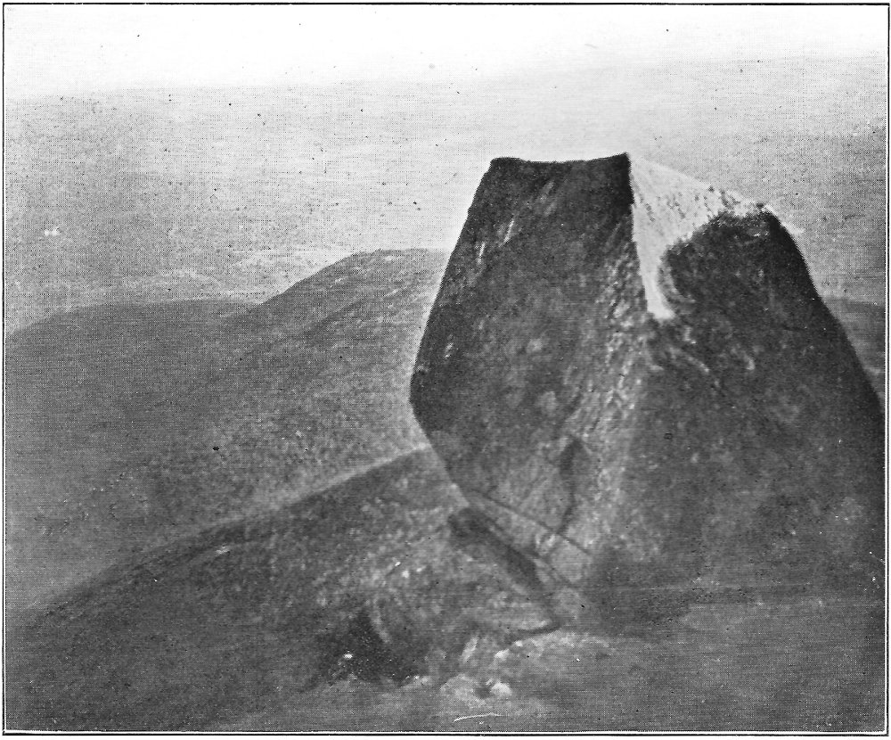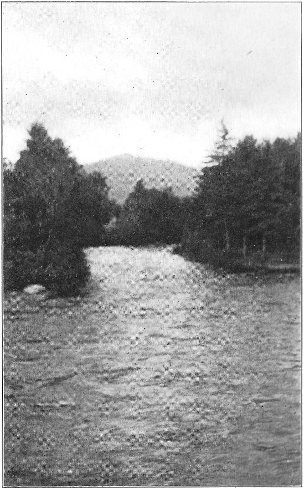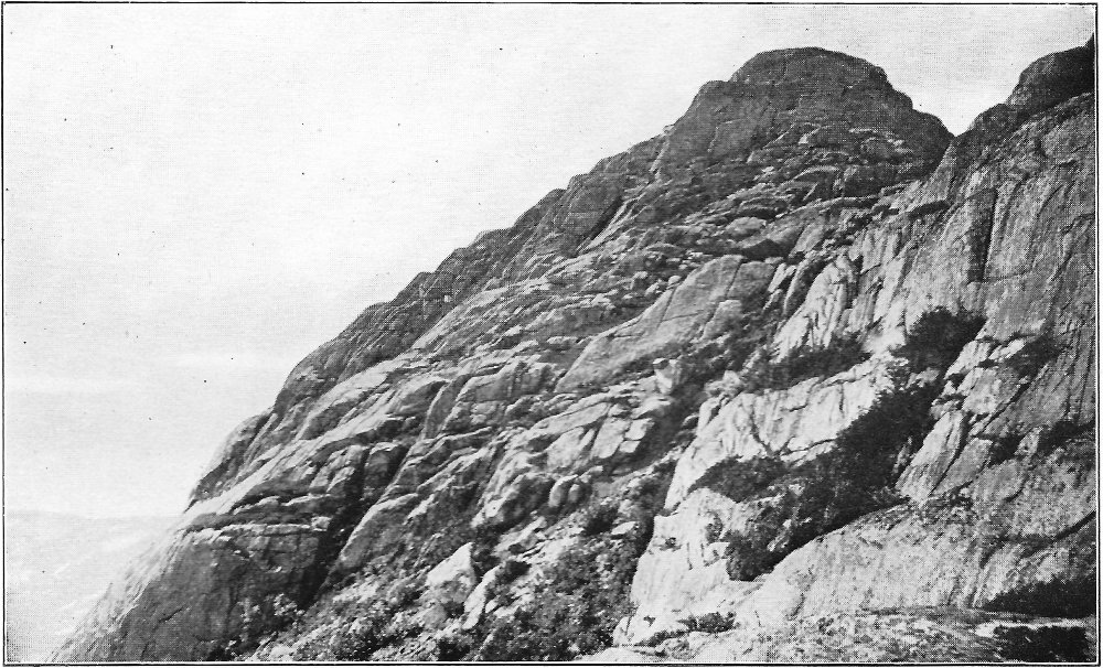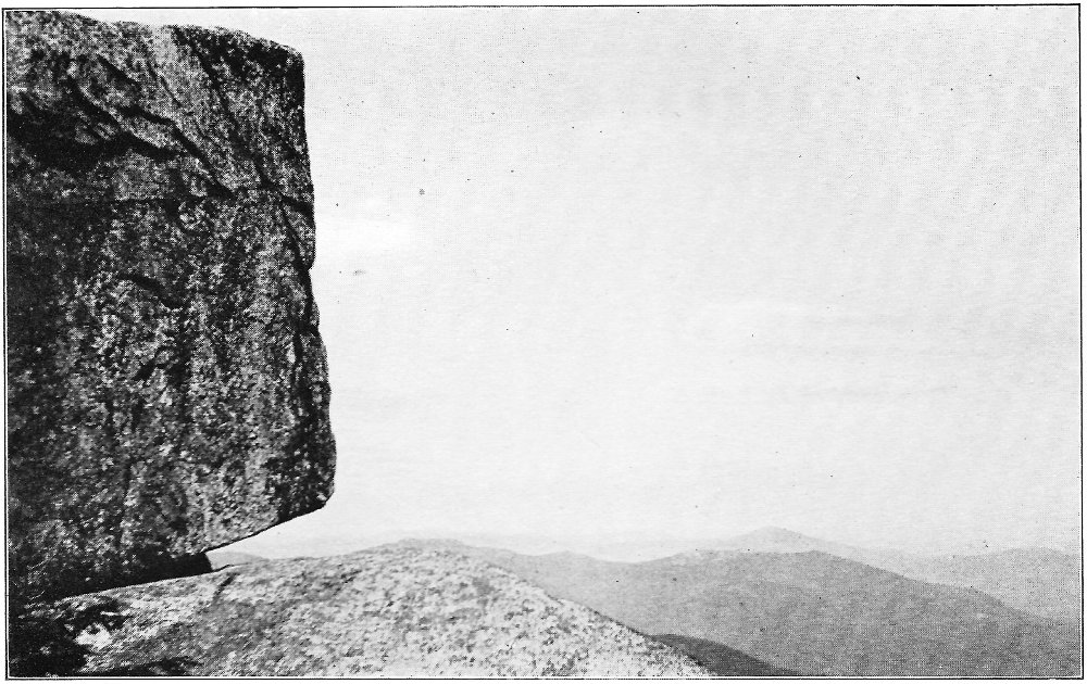 Leaving the swamp, I climbed the terrace marking the ancient border of the lake, which once included the swamp in its area, and passed through a grove of slender birches and poplars. Their stems, streaming with rain, were as bright as polished marble, and their foliage, illuminated by the clear sunlight, was marvelously green against the deep blue of the sky. Presently a vista opened northward, and at its end rose the dark peak of Chocorua. After a rain this towering rock presents a noticeably different appearance from its normal coloring. Most of its surface is covered by lichens, one species of which, when dry, resembles burnt paper. When rain falls upon these lichens they alter their tints, and the burnt paper species in particular becomes so green that a wonderful 8 change takes place in the whole coloring of the mountain. Looked upon through the birch vista, the air being clear and clean, and the colors of the mountain uncommonly bright, the peak seemed near at hand, and even grander than usual. There are few things in New England as truly picturesque as this horn of Chocorua. Three thousand feet above its lake and the level of the Saco, the great rock lifts itself with bold and naked outline into the midst of the sky. No foot seems able to creep up its precipitous slopes to its dizzy tip, and even the sturdy spruce can cling only to the deep clefts in its storm-swept ledges. There was a time when the forest reached to its crest, and when the cold rocks, now naked, were covered deep in soil and mosses. Passaconaway, close by, shows how this could have been, and how Chocorua must have looked draped in evergreens. Fire and hurricane destroyed the trees; the parched soil was washed away from the rocks; and now the only trace of the old forest growth is an occasional bleached stump or log hidden in a cleft in the ledges.