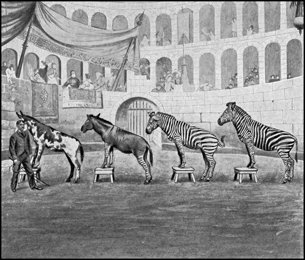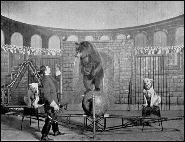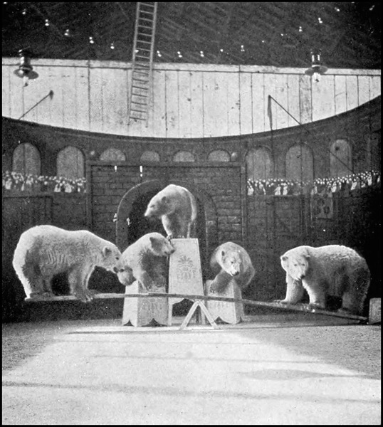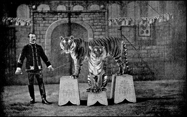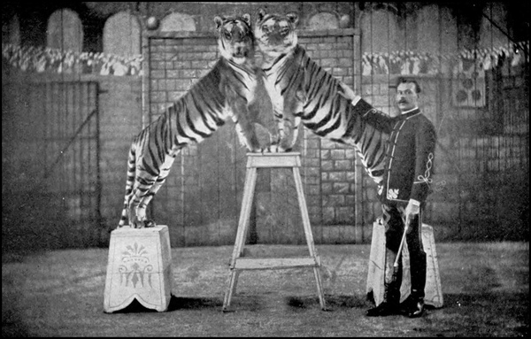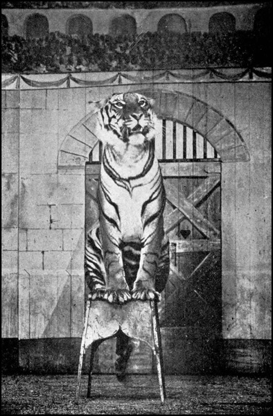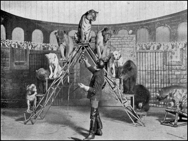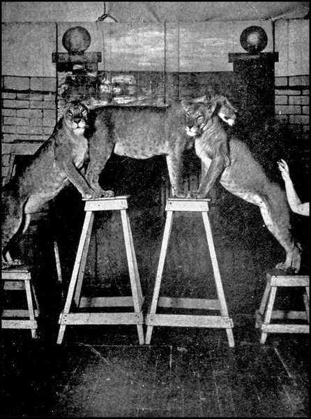 The apparent lashes given with the whip during performances are mere pretenses, part of the daily program, and known to the animals as such. True, these supposed lashings call forth growls and snarls, but this is because the animal knows it is a signal for him to do something, and he does not often feel234 inclined to do it. He generally does it, but he always protests a little if he can, and growls and snarls form his speech.