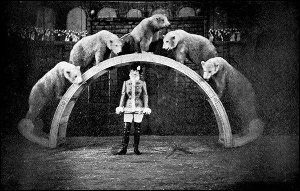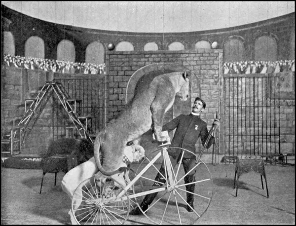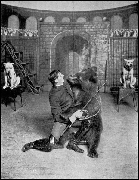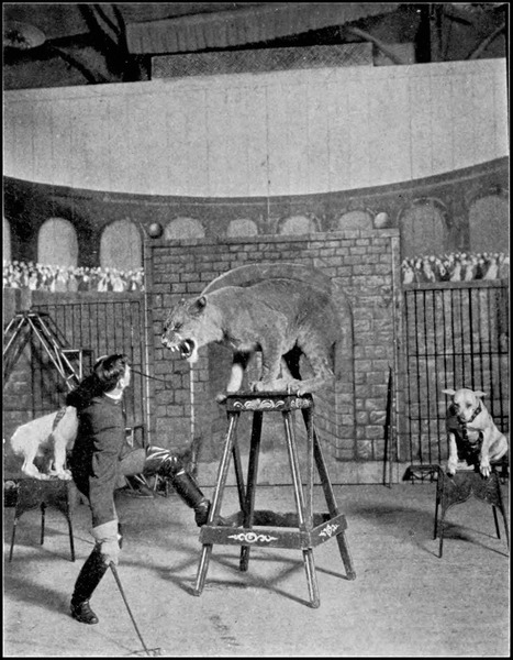 Of course, no animal is ever to be trusted until he is dead; but if the trainer is in a cage and gets cornered, experience teaches him what to do. He learns to think and act quickly, to retain a natural sobriety and coolness,228 never to lose his temper with a wild beast, and to make him obey every time, at all costs. It is never the physical force of the trainer that conquers; that is impossible. It is his coolness, determination, and untiring patience.