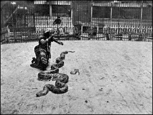 This is dangerous enough, but the most dangerous trick of all is when she allows one of her jaguars, Cartouche, to place the weight of his prostrate body on a stick held horizontally in her hands and over her face, while she looks up into his glaring eyes.