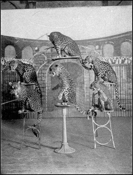 Mme. Morelli is a small woman and rather frail, but her nerve and quiet self-possession are truly wonderful. Leopards, panthers, and jaguars are noted for their stealthy, sly ways, and their deceit and treachery. They are most difficult to train and subdue, and can never be relied upon. These cringing big cats are the most alert fiends by nature; they have none of the nobility of the lion, none of the aloofness of the tiger. They are cowardly223 and sly, and are always watching an opportunity to spring on the trainer’s back on the slightest provocation, so that the training of them is more perilous than work with any other animals. And yet this small woman goes into the arena with five of them, makes them go through various acts and manœuvers, and finally sits down among them and allows one or two of them to lick her hands, and even to take them in their treacherous mouths.