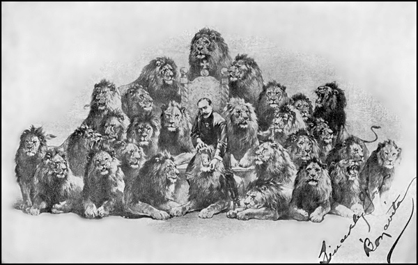 The wild animal performances of 1893 were small affairs compared with the exhibitions of to-day, but his performance with five male lions gave the World’s Fair visitors much to talk about, and secured for him a great reputation in this country, and I am naturally proud that he began his career in one of my establishments.