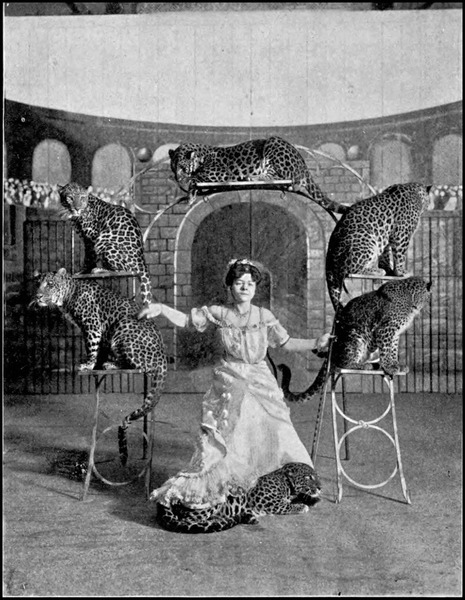 In this instance it was Captain Bonavita who rushed in and saved her, beating the leopard back and keeping it at bay until Mme. Morelli was safely out of the way, and the animal could be sent back to its cage. This was one of the most serious accidents she ever had, and great persuasion was brought to bear on her afterward to give up that leopard, but she would not hear of it. She was ill for some time, but as soon as she was able she re-entered the arena and made each leopard obey her as before. It is always a matter of wonder to see leopards perform, but to see four or five do so with one small woman is a marvelous sight, and proves what can be done in the way of mastering even such treacherous and vindictive creatures as leopards and jaguars.