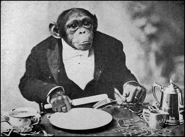 A wonderful proof of training is the man-ape, or chimpanzee, Consul. This animal eats and drinks like a human being, plays the piano, uses a typewriter, and behaves in such a wonderfully225 human way that one begins to wonder whether Darwin’s theory is not right, after all.