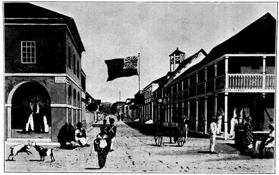 | Kingston, Harbour Street in 1820. From a coloured engraving in Hakewill’s “Picturesque Tour of Jamaica” | facing 150 |