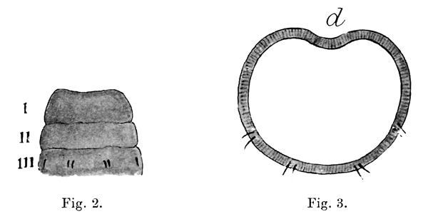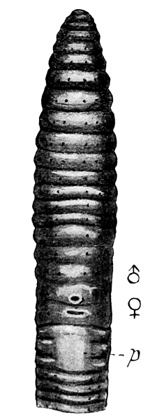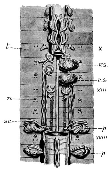 So too with the Trigastrinae where there are either two or three gizzards; but in this sub-family another modification has become apparent. The paired nephridia have disappeared and their place is taken by several, often quite numerous, pairs of much smaller nephridia called on that account 'micronephridia' instead of 'meganephridia.' To this sub-family belong the especially African but also American and Malayan Dichogaster, whose name is 16 derived from the important fact that it possesses two gizzards.