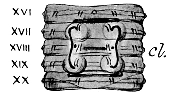 Fig. 4 The same species. Ventral view of segments XVI-XX (numbered in the figure) which form the clitellum, the posterior boundary of which is shown by a curved line on segment XX. The figure will be understood from the annexed description.