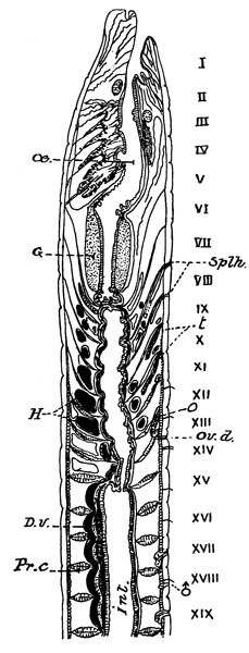 Fig. 5. A longitudinal section through the middle of the first nineteen segments of the body of Notiodrilus vasliti (a species very closely allied to that described in the text), the segments are numbered I, II, &c. D.v. dorsal blood vessel, G gizzard, H hearts, œ oesophagus lying in front of gizzard behind which another tract of still narrow oesophagus is seen opening into Int. intestine. The whole alimentary canal is supported by the intersegmental septa (Pr.c.) between which is the system of spaces forming the coelom, ov.d. pore of oviduct, Splh. orifices of spermathecae, ♂ orifice of sperm duct, o ovary, t spermaries. (After Eisen.)