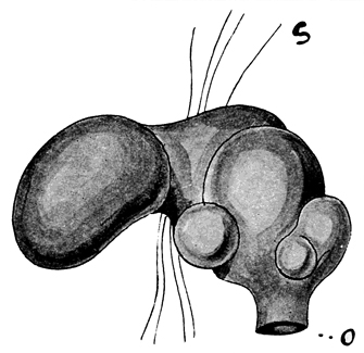 Fig. 7. A spermatheca of Notiodrilus tamajusi. The external orifice is shown at o; above this are the diverticula, s is a portion of an intersegmental septum. (After Eisen.)