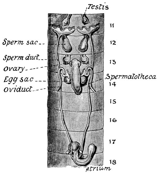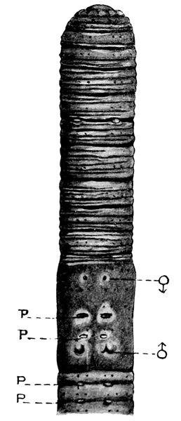 On segment XIV are a pair of very minute pores a little in front of the ventralmost setae and thus very near together. These are the openings of the oviducts. Finally, near to the anterior border-line of segments VIII and IX and on a line with the ventral pair of setae is a pore on each side through which the cavity of the spermathecae reaches the exterior.