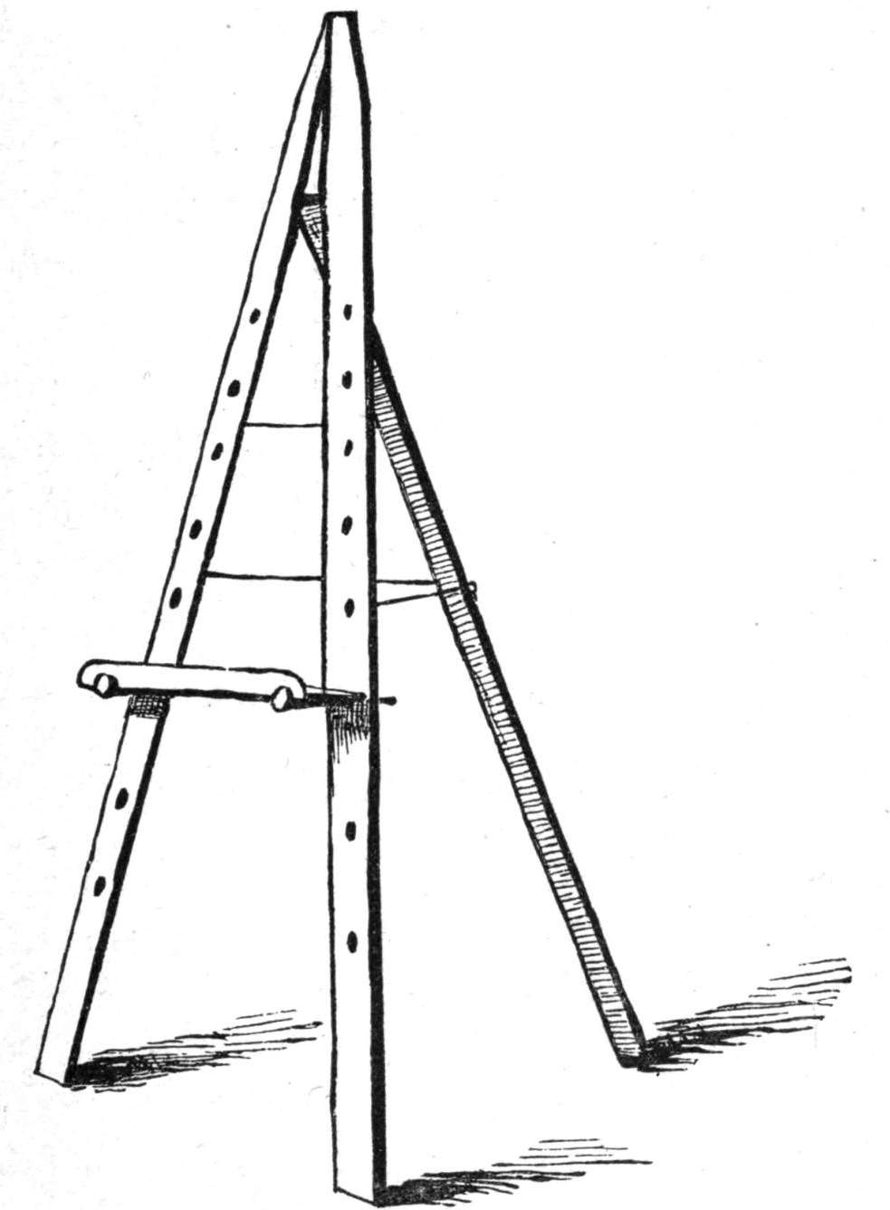 This easel may be of the simplest character, and is made of three straight bars of pine wood jointed so as to stand upright, with holes perforated through two of the bars about two or three inches apart. Through these holes pegs are stuck upon which to hold a narrow wooden tray. Upon this the stretcher, drawing-board, or portfolio is placed.