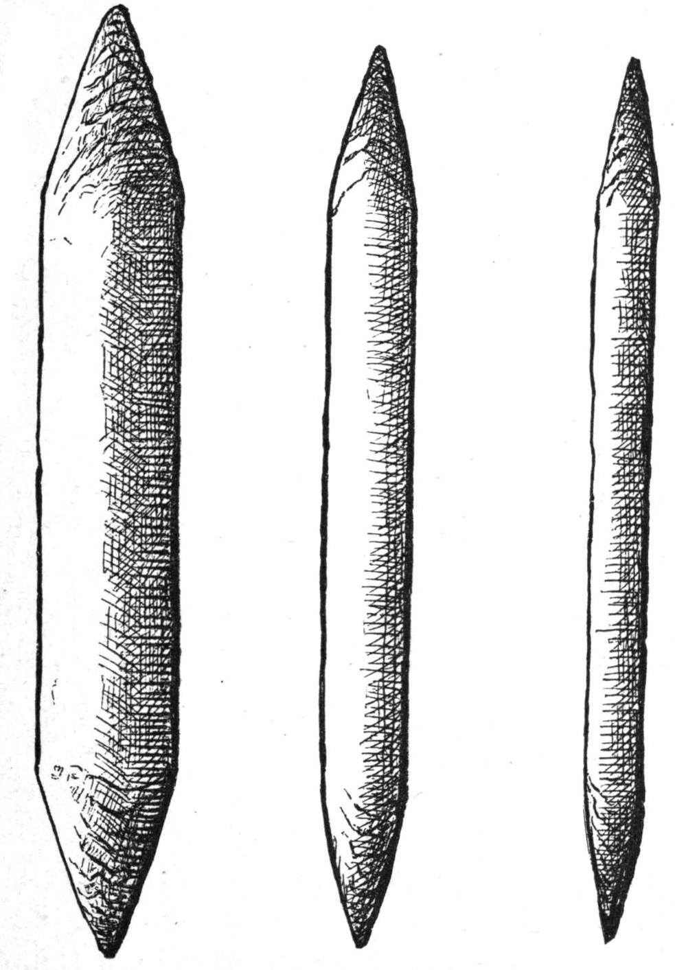 The other form of paper stump, known as the tortillon, is made of strips of paper rolled to a point like spills, and sold in bundles of a dozen for a few cents. Some artists prefer these, but for general purposes, the double-pointed paper stump is the best. About six of these are necessary: two large, two medium, and two very small ones; for it is always better to have a clean duplicate of each size.