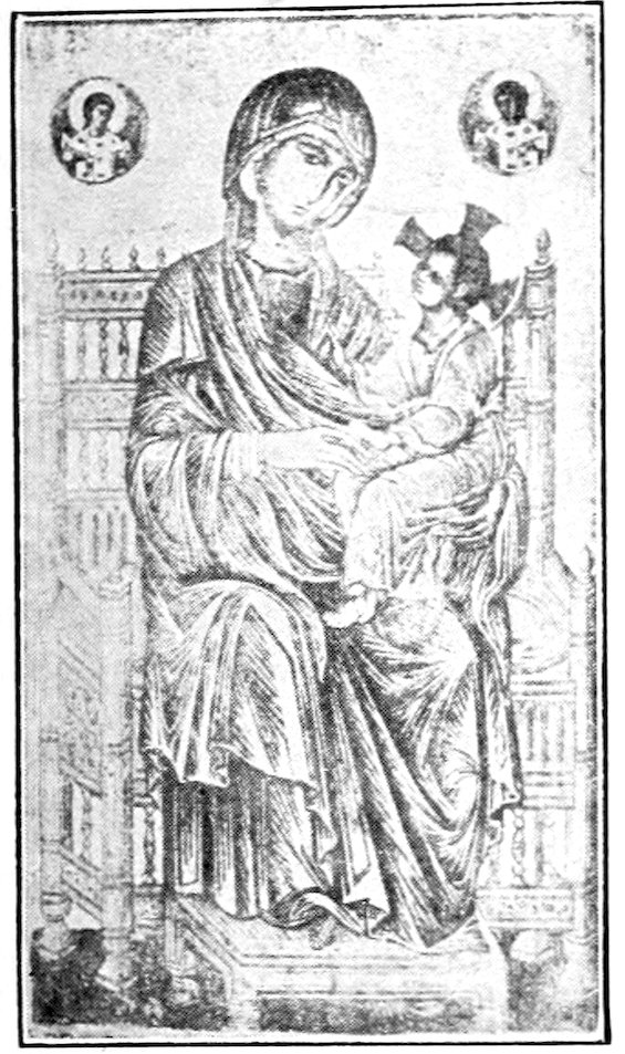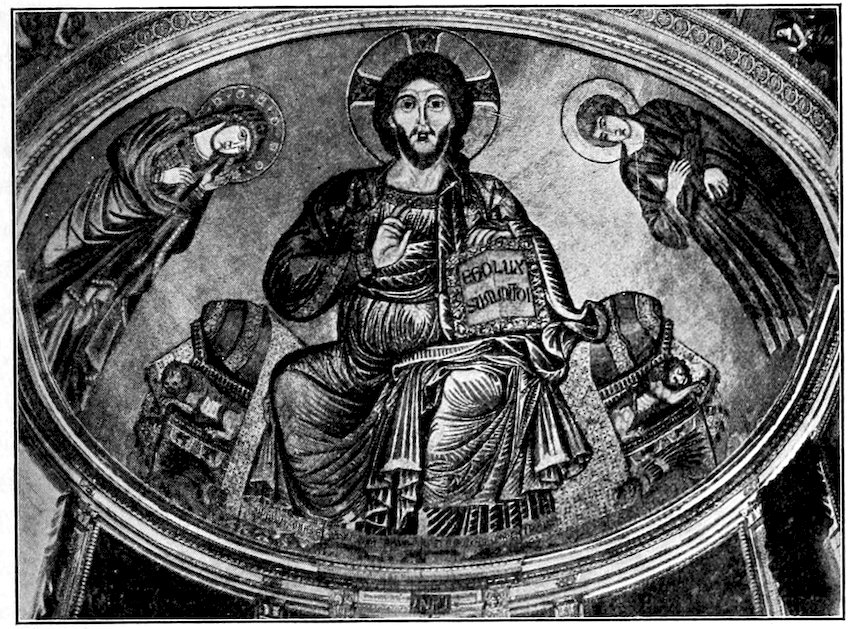But hardly, except perhaps in architecture, Italian art. We have sporadic provincial expressions dominated from afar by the prestige of the Eastern Roman Empire. At Constantinople there was a permanent court, a ceremonious civilization, an artistic blending of the traditions of old Greece and of the mysterious Levant. The merchants of the world sought from Byzantium, jewelry, enamels, embroideries, brocades, carved ivories, and pictured manuscripts. She was to the early Middle Ages what Paris is to ours—the æsthetic fashion 10maker of the world,—and her skilled artists went far afield as so many missionaries of the Byzantine style. We find them making the mosaics of Ravenna in the 6th and 7th centuries, of St. Mark’s at Venice from the 9th century, of many Roman churches from an even earlier date, of Palermo in the 12th, and of the Baptistry at Florence in the 13th. This Byzantine manner, as practiced by the travelling Greek artists and by their innumerable Italian imitators, is the real starting point and jump-off place for Italian painting. Hence in first studying the Byzantine style we do but imitate the Italian painters who immediately preceded Giotto.
