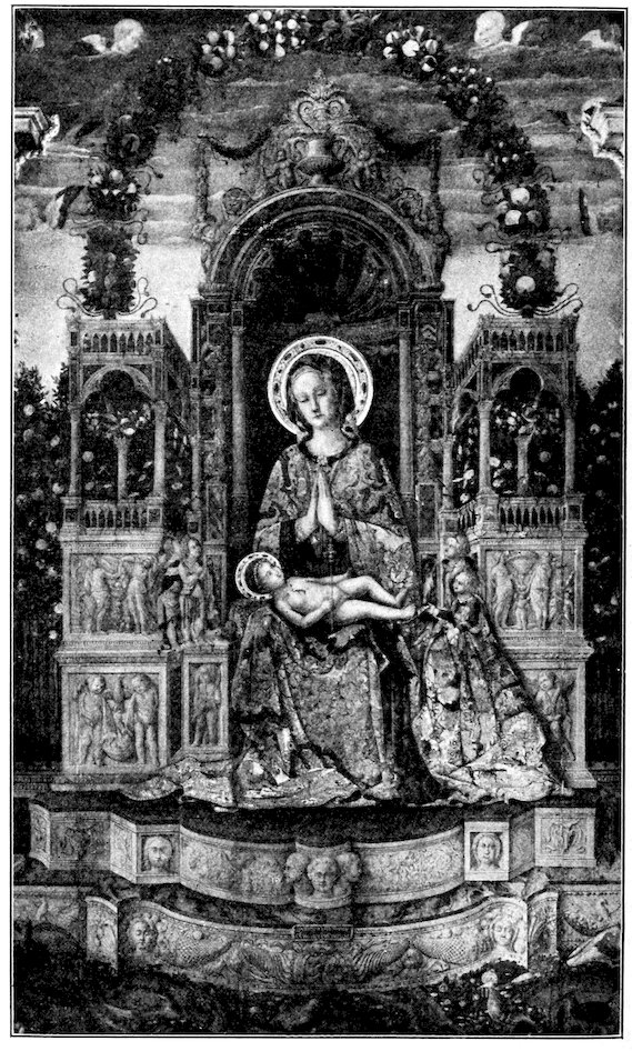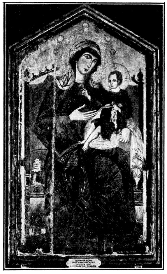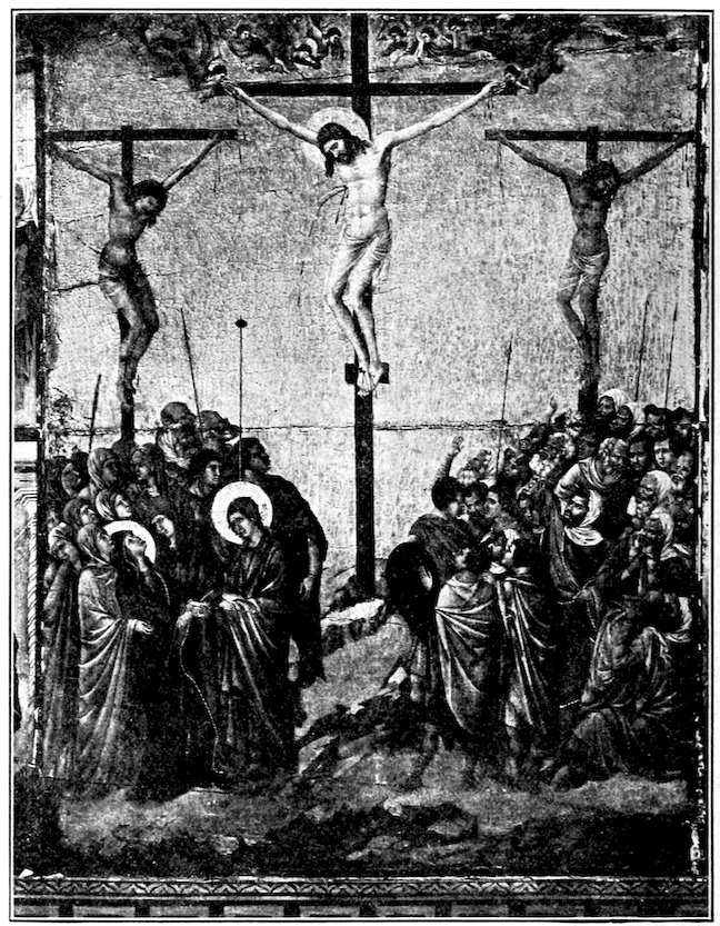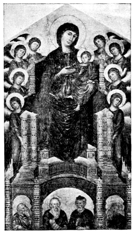 With the deepening and broadening of personal, civic, and religious emotions, the painter found new exactions laid upon him which the bloodless art of Byzantium could not satisfy. New life called for new forms to express it. We find in sculpture from about the year 1260, that of Giovanni Pisano’s first pulpit—wholly classical in its dignity—a kindred endeavor in advance of the art of painting. The renewal took three forms: the more conservative spirits accepted the Byzantine formulas but endeavored to refine on them in a realistic sense, to add grace to austerity. Such moderate development of the old style fixed the character of the school of Siena and was magnificently initiated by its greatest artist, Duccio, active about 1300. A very beautiful Madonna of this general tendency is in the collection of Mr. Otto Kahn at New York, Figure 3. It has been quite variously attributed.[4] It seems to me, however, a pure Tuscan work by Coppo or a painter akin to him. For the greater spirits such a reform was inadequate. Refine the Byzantine formulas to the utmost—there was no 14gain, rather loss in strength. Accordingly a vehement spirit like Cimabue,[1–5] acknowledgedly father of the Florentine school, accepts the Byzantine tradition loyally, but seeks to make its rigid mannerisms express the new religious passions. At times he is successful at this unlikely task of putting new wine into old bottles. His great enthroned Madonna at Florence, Figure 4, with solemn angels in attendance and grim patriarchs below her throne, may have been painted as early as 1285. It is faithful to the old monumental tradition—akin to the Christs and Marys of the mosaics—in its impressive richness is one of the most majestic things the century produced. It reveals the docility of its creator but only partially his power. We have hardly his hand but surely an echo of his influence in the tragic crucifix in the museum of Santa Croce. It is the moment of agony, and the powerful body writhes against the nails, while the head sinks in death. It may represent hundreds of similar crosses that stood high in air on the rood beam before the chancel, in sight both of the preacher and his public.