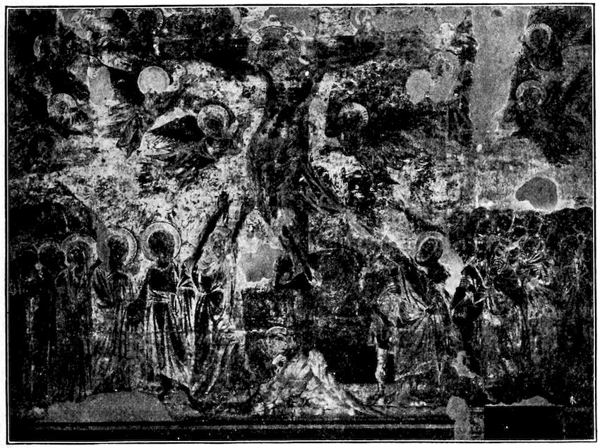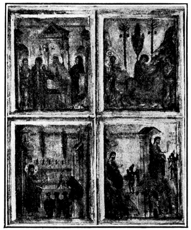 Byzantine pictures have come down to us on the largest and on the smallest scale—in the great mosaics and wall paintings, and as well on small panels and in the illustrated books used in the ritual of the church. Both are important. The mural decorations are what the early Italian painter had constantly before his eye; the miniatured psalters, Gospels, lectionaries, chorals and prayer books, afforded the patterns from which he drew with little alteration the standard compositions of the Annunciation to Mary, the Nativity of Christ, His Adoration by the Shepherds and Kings, His Baptism, the Raising of Lazarus, the Last Supper, Crucifixion, Descent into Hell, Resurrection, and Ascension. But Byzantine design is most imposing in its monumental phase. The most careless traveller still feels awe before those solemn figures of Christ supreme ruler (Pantokrator) and his Mother queen of heaven which are seen throned against a background of azure or gold and attended by solemn figures of apostles and martyrs, Figure 2. The forms are flat,—silhouettes enriched by interior tracery, the arrangement in the space formal, symmetrical, highly decorative. The smaller narrative compositions,[2] Figure 1, are clearly conceived but have small emotional appeal. For this reason the Italians of the Golden Age spoke of the Byzantine style as rude. This is an error. Rude in the hands of half-trained local imitators, the style as formulated in the 9th century 12at Constantinople was highly sophisticated and decoratively of great refinement. It was based on an admirable system of color spotting and a fine understanding of silhouette. The contours were cast in easy conventional curves. These were enriched within by hatchings and splintery angles of gold which contrasted effectively with the fluent outlines. Everything was done by precept and copybook. In four centuries before the year 1300, the style showed little change, indeed is still alive in the mountains of Macedonia and, until the Revolution, in Russia. The Byzantine artist seldom looked at a fellow mortal with artistic intent. He looked at some earlier picture or considered his own color preferences. Conventional and anæmic as the narrative style was, it did all that was required of it. Nothing better serves the purpose of an authoritative Church than the awe-inspiring Christs of the Lombard and Sicilian and Roman apses, and so long as the Church felt no duty beyond that of plain statement of her claims, the unfelt narratives from the Scriptures served every religious need.