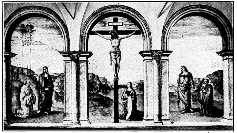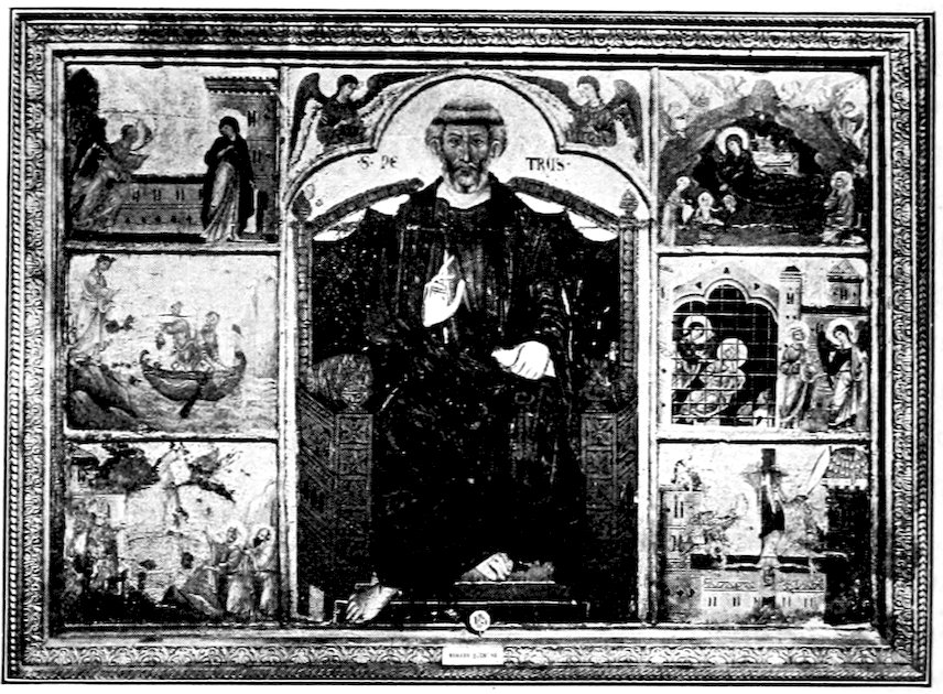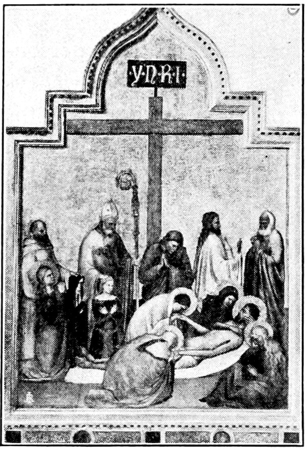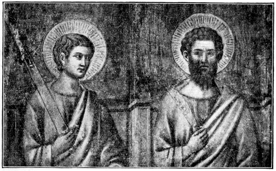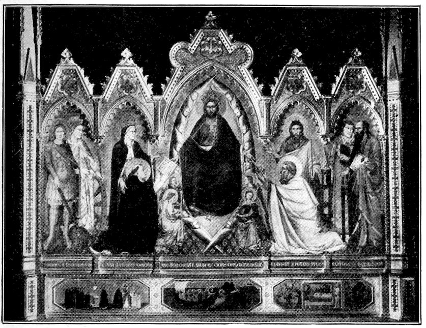 At about this period I think we may set the several crucifixes in Florentine churches, without inquiring too narrowly whether they are by the master or by scholars. Giotto has developed a singularly noble type. The Christ is no longer contorted in agony as in the crucifixes by Cimabue. He is dead, with his head quietly sunk on the powerful breast, and the body relaxed. The conception is humanistic. One feels 34chiefly the pity of stretching that glorious thing that is a man’s body on a cross. Probably the earliest of these crucifixes is that at Santa Maria Novella, while the finest is at San Felice. About 1320 we may set the dismembered ancona, painted for Cardinal Gaetano Stefaneschi, which originally stood on the high altar of St. Peter’s, Rome. The tarnished fragments which you may still see in the sacristy, are more splendid in color than any other tempera painting whatsoever. Probably only the central panels, Christ and St. Peter enthroned, are from Giotto’s hand, the side panels representing the martyrdom of Peter and Paul may well be both designed and executed by the accomplished assistant who carried out the allegories at Assisi.