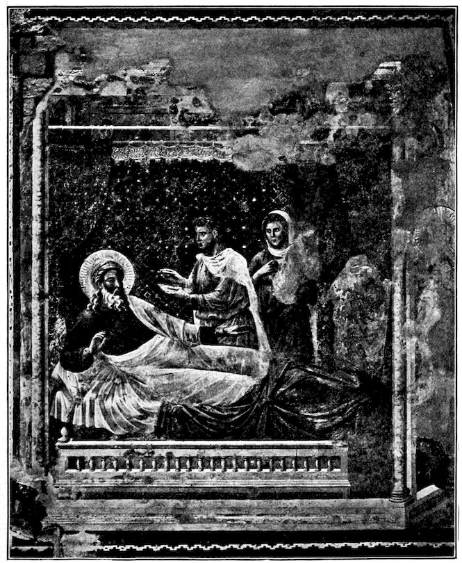 Giotto di Bondone,[7] according to the best information we 20have on a disputed point, was born in 1266, at the village of Colle, in the lovely valley of the Mugello. His people were prosperous and his way smooth. I see no reason for doubting the charming legend told by Ghiberti that Cimabue found the lad Giotto by the roadside diligently scratching the outlines of a sheep on a slate, and that that was the beginning of their association. In any case, we may surmise that he was early with Cimabue as apprentice and eventually went with the Master to Assisi to grind colors, clean brushes, and paint under direction. To be at that moment in the Franciscan Basilica was to be at the greatest creative center of the world. It seems to me likely that Giotto may have had a considerable part in the actual painting of the Old and New Testament stories in the nave, and I believe we may find his earliest designs in certain frescoes of the upper rows. The Lamenting over Christ’s Body, for example, singularly combines the energy of Cimabue with the dignity of Cavallini, and there are significant echoes of the composition in Giotto’s later version of the same theme at Padua. Tradition also ascribes to Giotto, maybe correctly, the Resurrection and Pentecost on the entrance wall.[8]