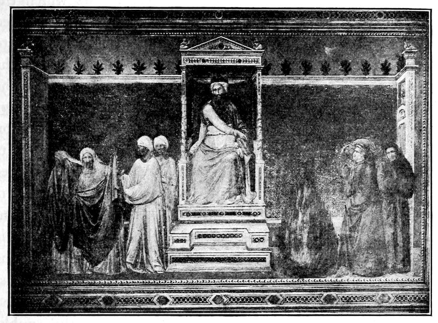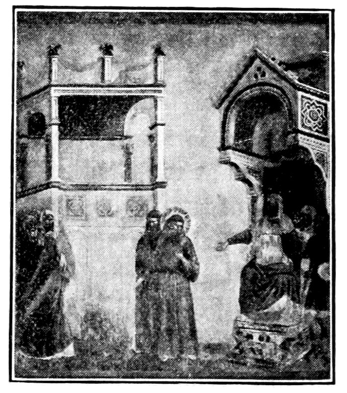 More remarkable still is the contrast between St. Francis Braving the Fire Ordeal before the Soldan, Figure 22, as depicted at Assisi and Florence. We have to do not merely with an immense 38advance in decorative composition, the accessories at Assisi being trivial and fantastic; not merely with progress towards a gracious symmetry and more massive and impressive form, but also with a complete change of moral point of view. At Assisi the Soldan is an ogre exacting a cruel test. The Moslem priests are a cowardly pack of magicians ignobly slinking away, St. Francis a grim fanatic. At Florence the Soldan is a noble and humane gentleman, amazed at an unreasonable ordeal forced upon his wise men. The Moslem doctors are splendid scholars grudgingly shrinking from an unfair test, St. Francis an alert little enthusiast half gloating over the confusion he has thrown into the enemy camp. With a by no means orthodox feeling, old Giotto, humanistic Giotto, almost seems to take, or at least to see, the pagans’ side of it. He who had written a manly poem against the excesses and hypocrisies of the Franciscan ideal of poverty, is now capable of criticizing the more extravagant propagandism of the saint himself.
