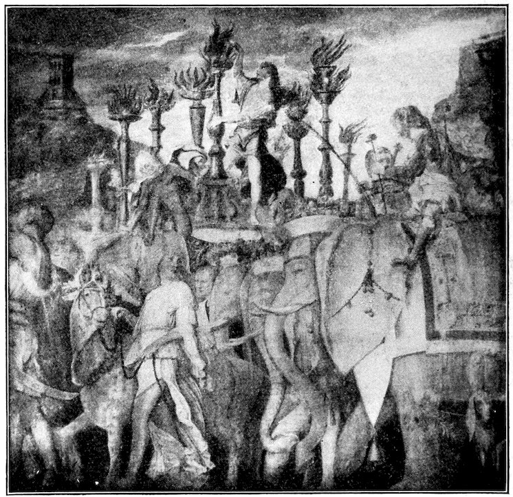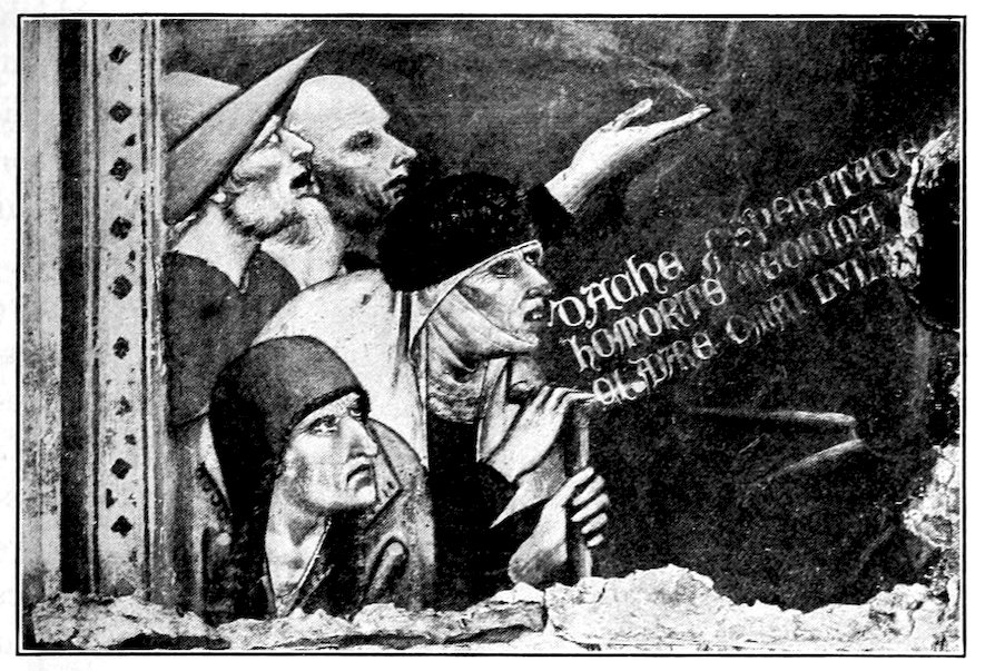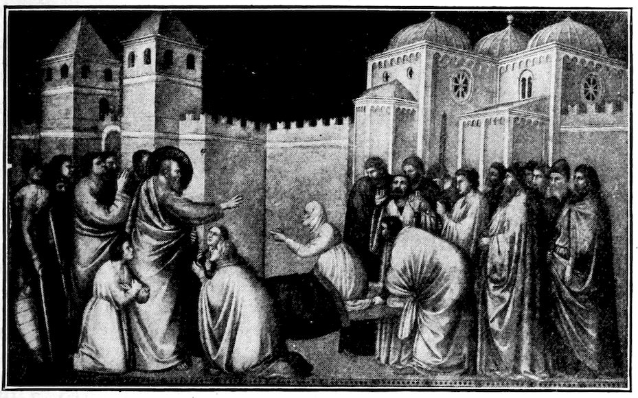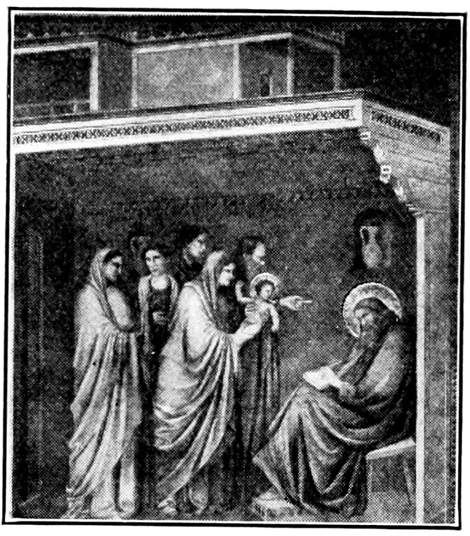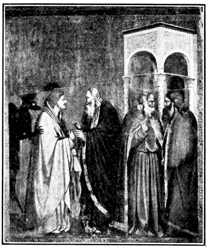 Next the eye will realize splendid people gravely occupied with solemn acts. There is the strangest blend of passion and decorum. See the eager old man who clutches his wife before a massive city gate while she caresses him tenderly, Figure 13a, note the firm gentleness of the bearded priest who handles a screaming baby before the altar, mark the sense of strain and hurry where a mother and child mounted on an ass, Figure 14, are pushed and dragged along by an old man and attendants. Or again, what sinister power in the scene where three Jewish magistrates press money upon a haggard, bearded, nervous man. You do not need the bat-like demon prompting him to know that it is the arch-traitor Judas, Figure 15. Then there is a strange, serene, processional composition, with the Virgin moving homeward among her friends to a solemn music, Figure 16. It has a rhythm like the frieze of the Parthenon. Perhaps your eye will fix longest on the scene where about the pale body of the dead Christ women wail with outstretched hands, or tend the broken body, while bearded men, accustomed to the hardness of life, stand in mute sympathy with folded hands, Figure 17. It is what the Gospel ought to look like. How Giotto shows every feeling, pushing its expression just to the verge, and there stopping, so 28that idyl and tragedy, devotion and wrath, treachery and fealty, fear and courage, each keeps its proper and distinguishing aspect, while all are invested in a common dignity and nobility. You will perhaps never have seen an art at once so varied and moving, and nevertheless so monumental, and you may well be curious as to the method.