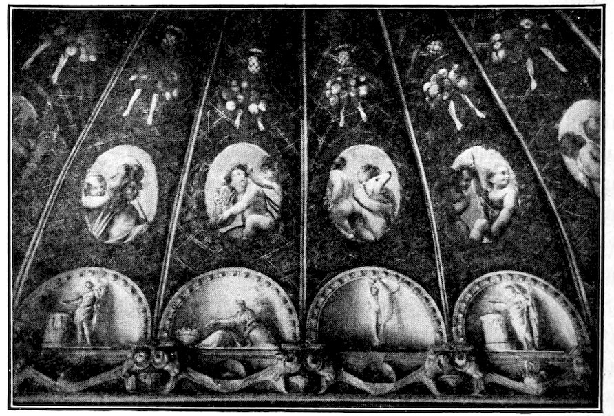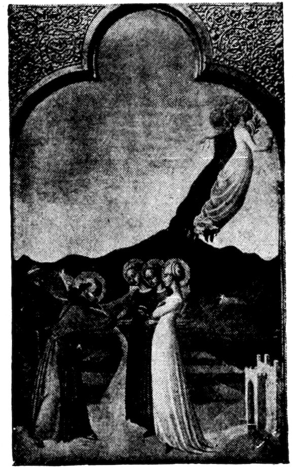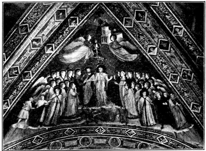 The first experiment towards a sweeter and more complex style was made in the cross vaults of the Lower Church of Assisi, immediately above the tomb of St. Francis. The subjects were the three virtues of the Franciscan vow—Poverty, Chastity, and Obedience—with a St. Francis in a glory of angels. In these great triangular compositions, allegory and symbolism run riot, and we do well to recall Hazlitt’s shrewd remark on Spenser’s “Faery Queene”—“the allegory will not bite.” Indeed one might forget it for the radiance of the azures, moss-greens, rose pinks, and deeper violets, for the delightful contrast of the freely composed groups with the intricate geometrical formality of the rich borders. Yet to ignore the allegory completely would be to forget the master’s intention. We may savor it best in the great composition: St. Francis Marries his Lady Poverty, Figure 18a. The bridal group stands on a central crag, Christ serving as priest, St. Francis slipping a ring on the gaunt hand of a haggard, yet strangely fascinating bride clothed in a single ragged garment. Her bare feet show through a crisply drawn and blossomless rose tree. Two urchins at the foot of the little cliff stand ready to stone so unseemly a bride. From the central group to right 32and left, earnest groups of angels spread in a descending curve. In the lower angle, left, a young man gives his rich cloak to an old beggar, while an angel points to the bridal: Poverty is accepted. At the lower right corner, another angel attempts to detain a young man who passes with a gesture of contempt in the company of two portly priests: Poverty is rejected by such. From the apex of the great triangle, the hands of God descend to welcome two angels, one of which offers the cloak given to the beggar, and the other a model of the church which is the splendid covering for the body of the Saint. The fantastic beauty of this and its companion pieces can only be appreciated on the spot. No frescoes of Italy surpass these for loveliness of color and perfection of condition. It is the most beautiful pictured Gothic ceiling in the world, perhaps the most fantastically beautiful of all figured ceilings whatever.