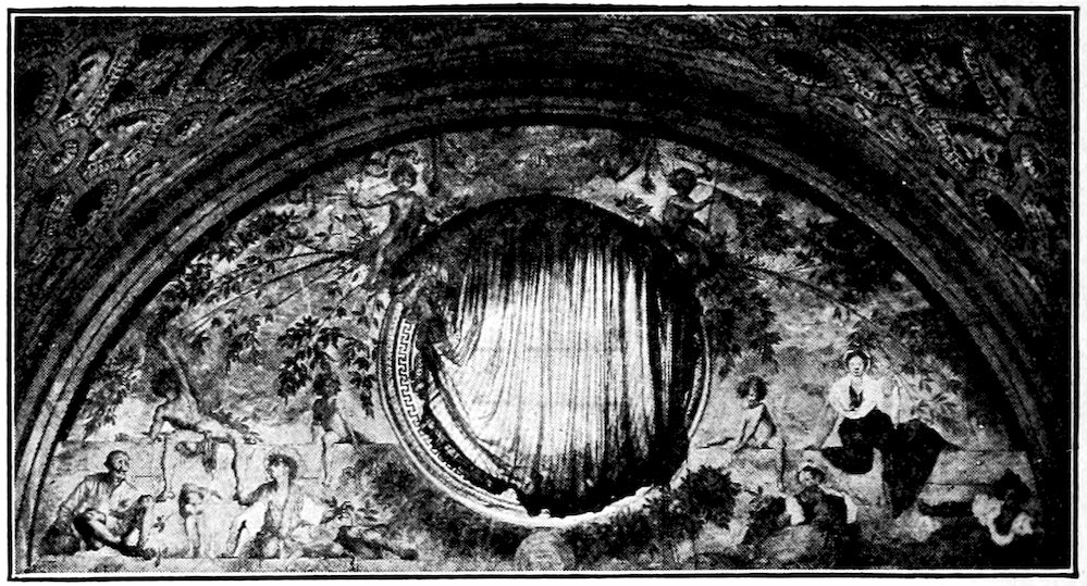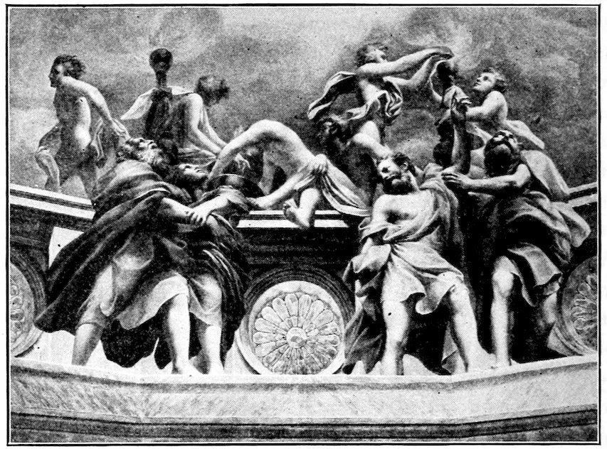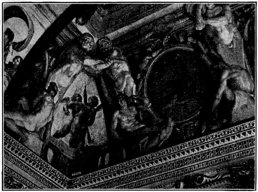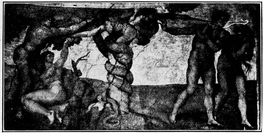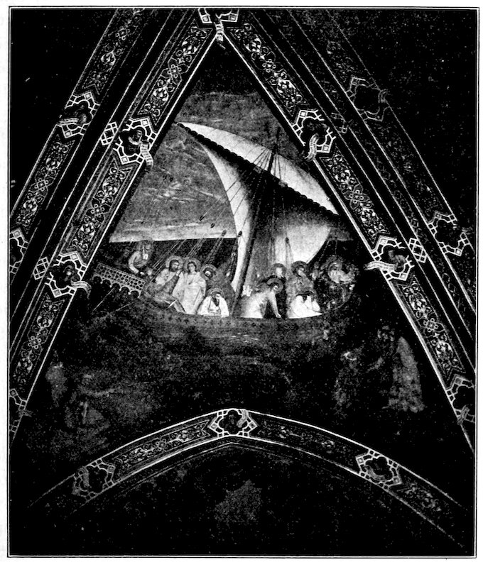 It was at Rome that young Giotto was to broaden and refine his art. He was called thither before the year 1300 to design the great mosaic of Christ walking on the Sea of Galilee beside the tempest-tossed boat of the Apostles. It stood over the inside cloister-portal of old St. Peter’s, and has been many times moved in the rebuilding of the church, and with each move restored, so that what we now see in the porch is entirely remade. From certain fragments of the old mosaic, and old sketch copies, Figure 12, we may judge that the Navicella, as the Italians loved to call it, was an elaborate composition of great dramatic power, the logical consummation of the experiments at Assisi. Our best version of the Navicella is Andrea Bonaiuti’s adaptation, Figure 31, for the vault of the Spanish Chapel, 1365.