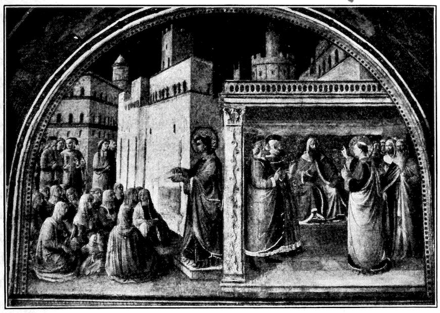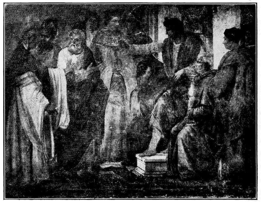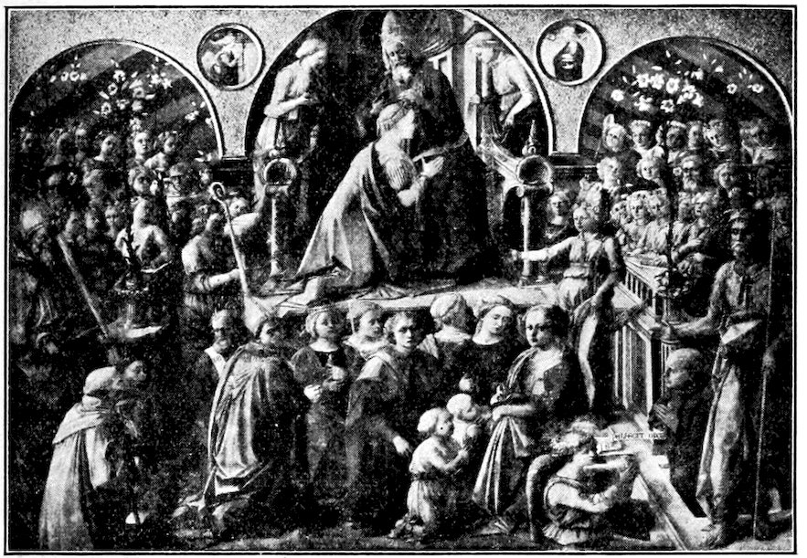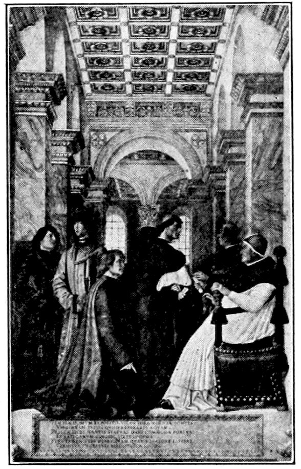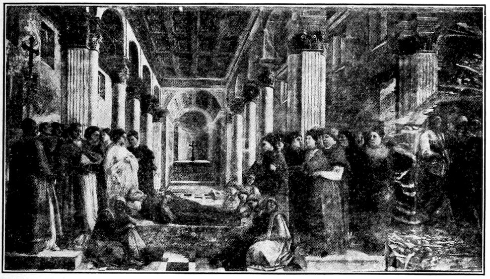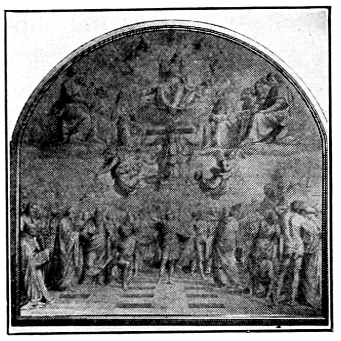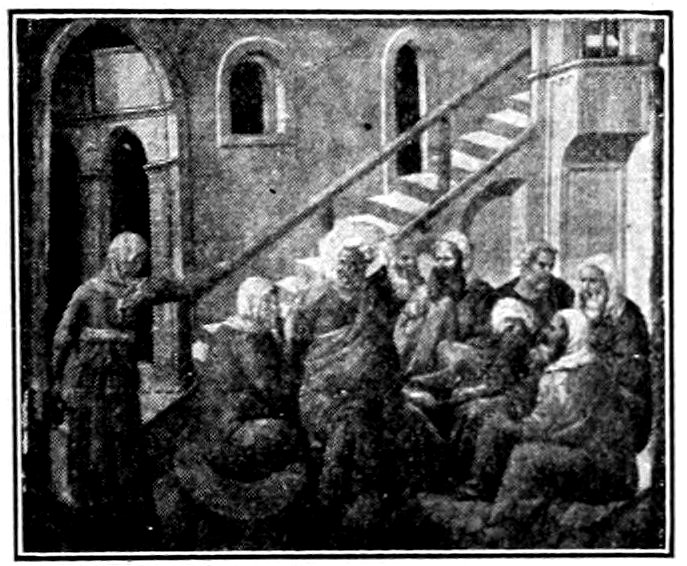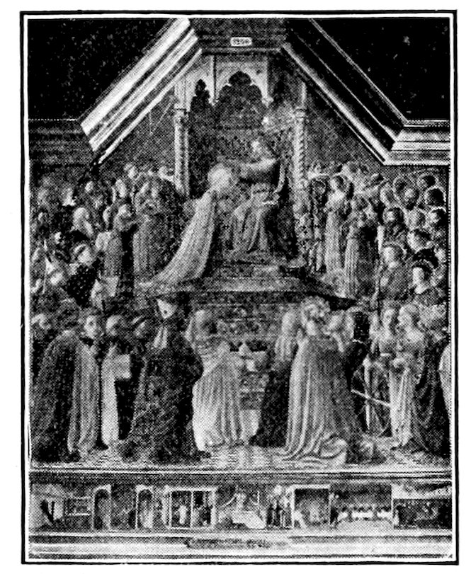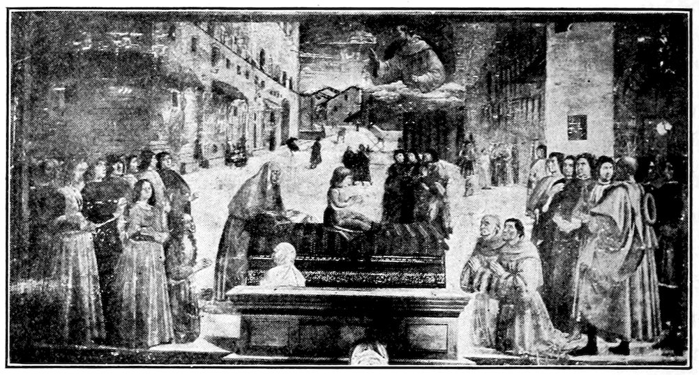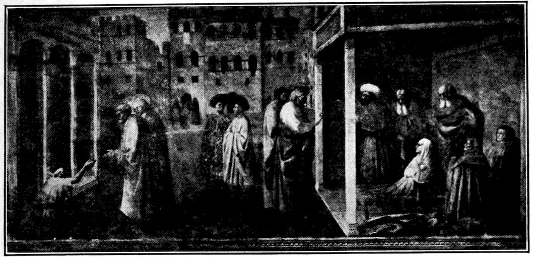 So much for the shop methods. Now for him who makes shops possible—the patron. A wealthy Florentine as naturally wanted to invest in a frescoed chapel as a wealthy American 7does in a fleet of motor cars. Considering the changed value of money, one indulgence was about as costly as the other. But the Florentine never quite regarded paintings as luxuries. They were necessary to him. He loved them. They enhanced his prestige in this world and improved his chances in the next. Then to beautify a church was really to magnify the liberty and prosperity of Florence, which largely derived from the Holy See. Recall that every Florentine was born a Catholic, baptized in the fair Church of St. John with the name of a saint. This saint, he believed, could aid him morally and materially, was in every sense his celestial patron. It paid to do the saint honor, and that could best be done through the painter’s art. The poorest man might have a small portrait of his patron, a rich man might endow a chapel and cause all his patron’s miracles to be pictured on the wall. Think also that every altar—a dozen or more in every large church—was a shrine[1], containing the bread and wine that by the never-ceasing miracle of the Mass became the Saviour’s body and blood; and was also a reliquary or tomb, containing in whole or part the body of some saint. Every altar then, and every chapel inclosing one, cried out for a twofold interpretation of its meaning. Everything about the Eucharist had to be explained (involving pretty nearly all of Biblical history), and the particular relic required similar illumination. Since many of the faithful could not read, and the Catholic Church has ever been merciful as regards sermonizing, these explanations of the altar as miracle shrine of Our Lord and as tomb of a particular saint were best made pictorially, and generally were so made.