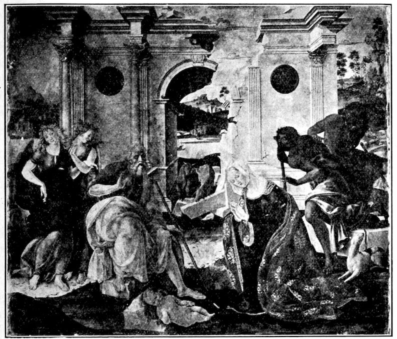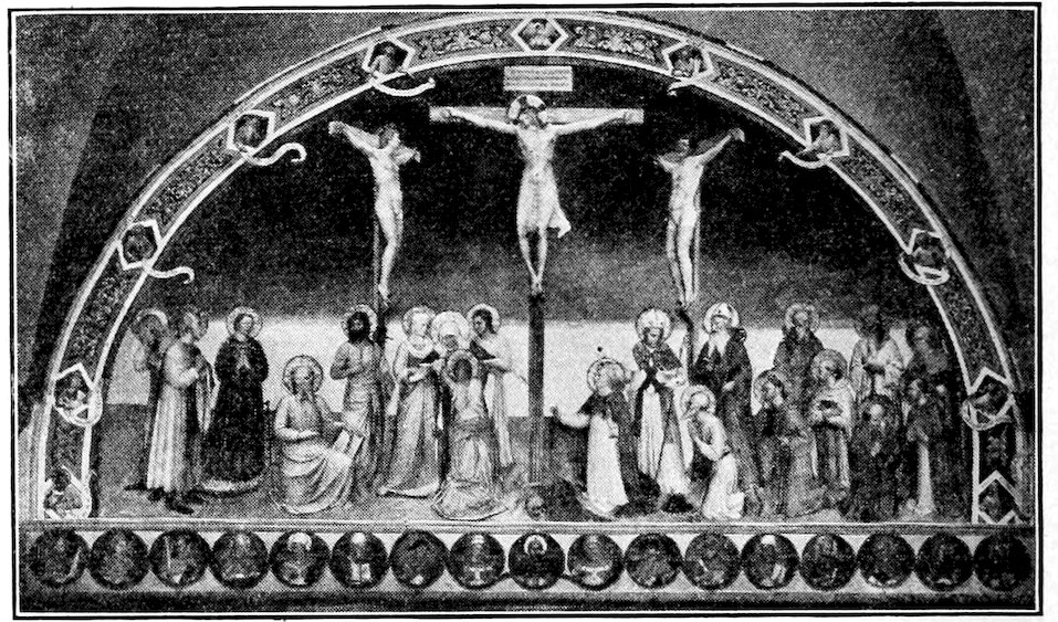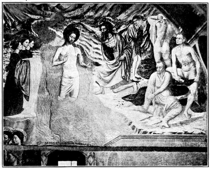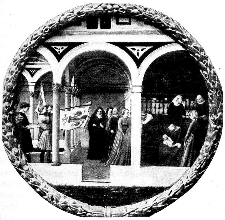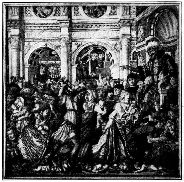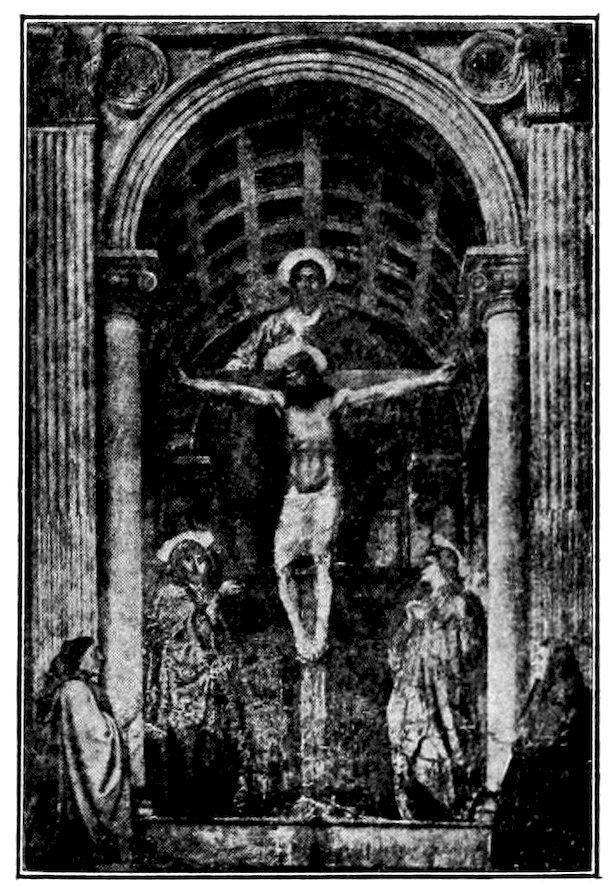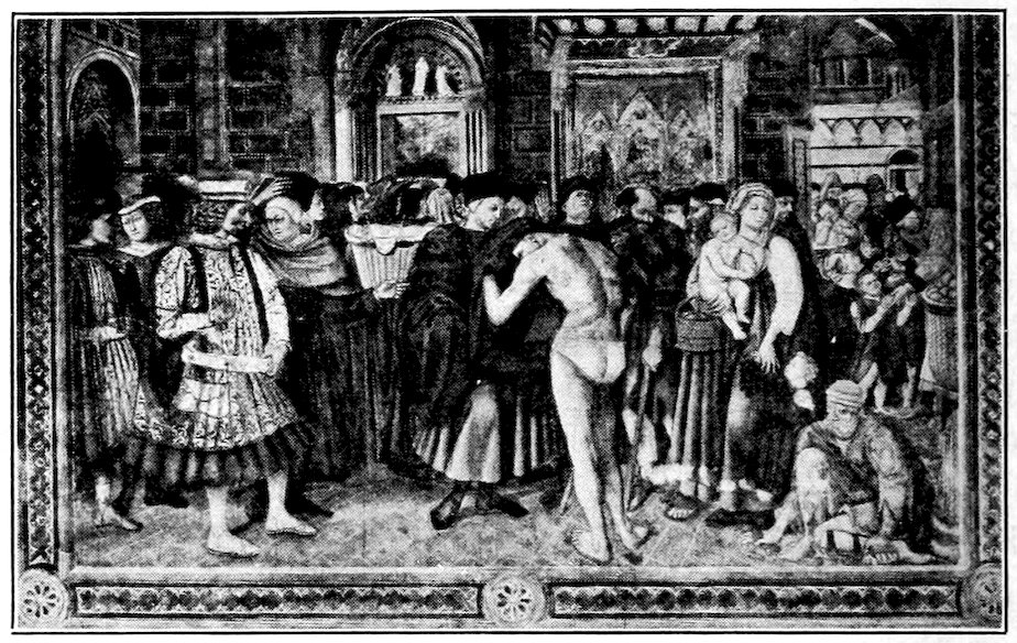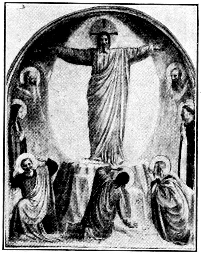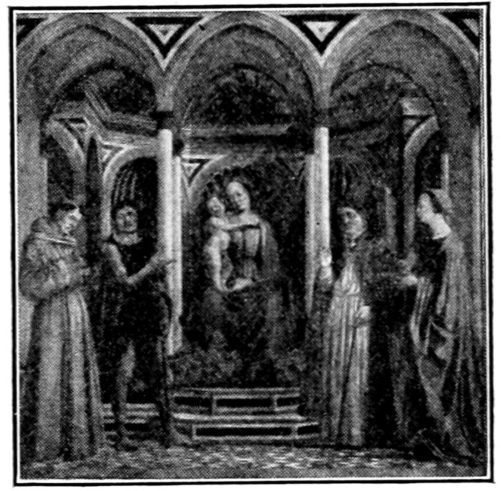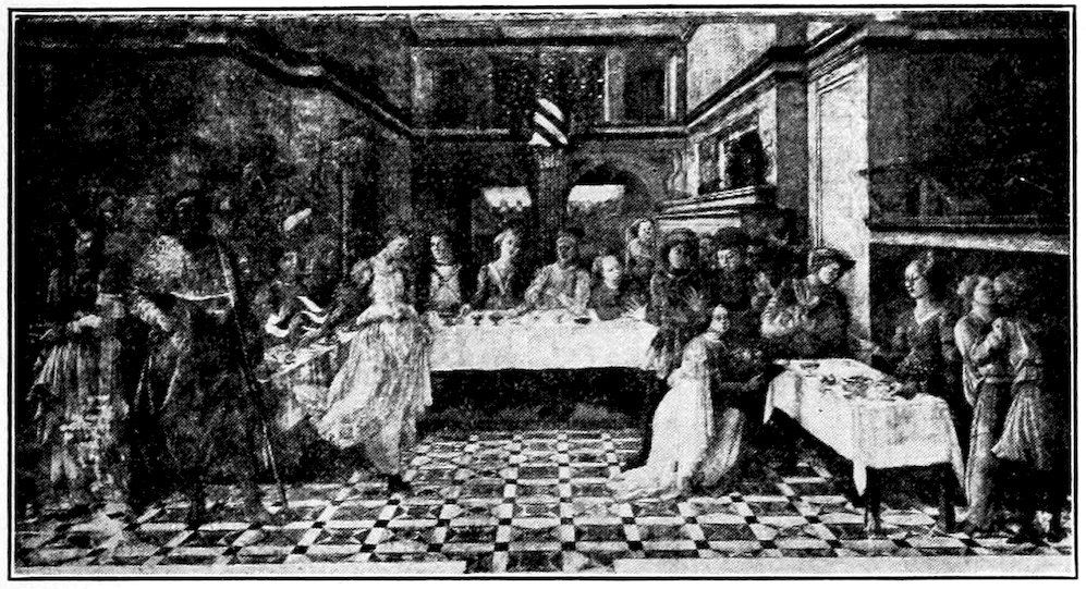 So much for the shop methods. Now for him who makes shops possible—the patron. A wealthy Florentine as naturally wanted to invest in a frescoed chapel as a wealthy American 7does in a fleet of motor cars. Considering the changed value of money, one indulgence was about as costly as the other. But the Florentine never quite regarded paintings as luxuries. They were necessary to him. He loved them. They enhanced his prestige in this world and improved his chances in the next. Then to beautify a church was really to magnify the liberty and prosperity of Florence, which largely derived from the Holy See. Recall that every Florentine was born a Catholic, baptized in the fair Church of St. John with the name of a saint. This saint, he believed, could aid him morally and materially, was in every sense his celestial patron. It paid to do the saint honor, and that could best be done through the painter’s art. The poorest man might have a small portrait of his patron, a rich man might endow a chapel and cause all his patron’s miracles to be pictured on the wall. Think also that every altar—a dozen or more in every large church—was a shrine[1], containing the bread and wine that by the never-ceasing miracle of the Mass became the Saviour’s body and blood; and was also a reliquary or tomb, containing in whole or part the body of some saint. Every altar then, and every chapel inclosing one, cried out for a twofold interpretation of its meaning. Everything about the Eucharist had to be explained (involving pretty nearly all of Biblical history), and the particular relic required similar illumination. Since many of the faithful could not read, and the Catholic Church has ever been merciful as regards sermonizing, these explanations of the altar as miracle shrine of Our Lord and as tomb of a particular saint were best made pictorially, and generally were so made.