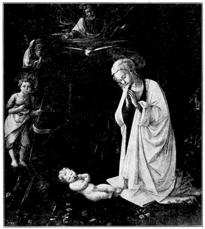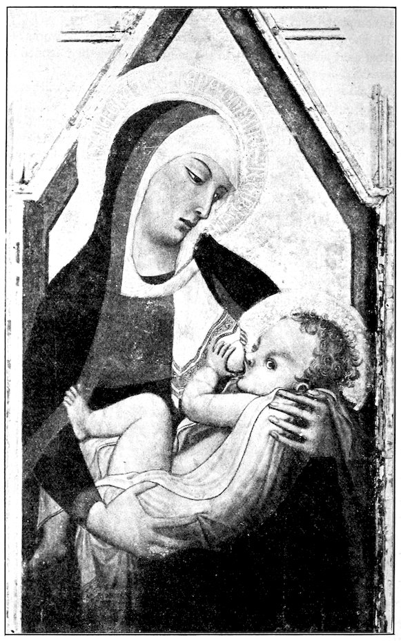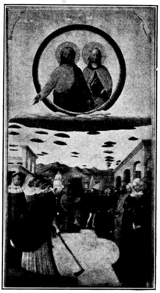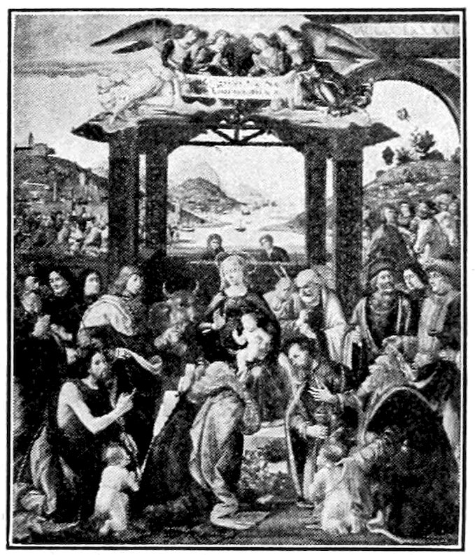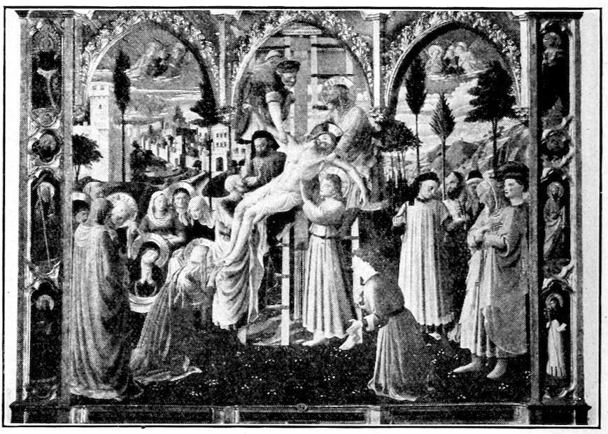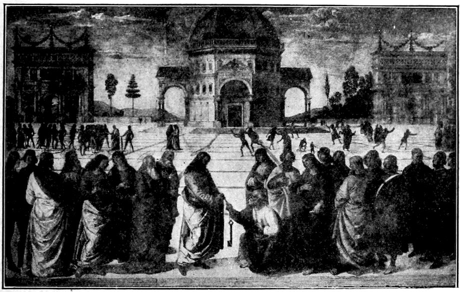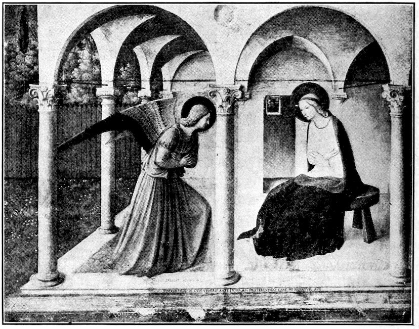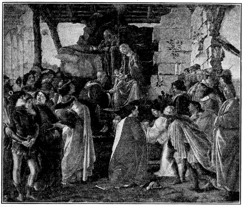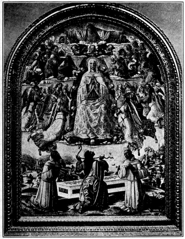 So much for the shop methods. Now for him who makes shops possible—the patron. A wealthy Florentine as naturally wanted to invest in a frescoed chapel as a wealthy American 7does in a fleet of motor cars. Considering the changed value of money, one indulgence was about as costly as the other. But the Florentine never quite regarded paintings as luxuries. They were necessary to him. He loved them. They enhanced his prestige in this world and improved his chances in the next. Then to beautify a church was really to magnify the liberty and prosperity of Florence, which largely derived from the Holy See. Recall that every Florentine was born a Catholic, baptized in the fair Church of St. John with the name of a saint. This saint, he believed, could aid him morally and materially, was in every sense his celestial patron. It paid to do the saint honor, and that could best be done through the painter’s art. The poorest man might have a small portrait of his patron, a rich man might endow a chapel and cause all his patron’s miracles to be pictured on the wall. Think also that every altar—a dozen or more in every large church—was a shrine[1], containing the bread and wine that by the never-ceasing miracle of the Mass became the Saviour’s body and blood; and was also a reliquary or tomb, containing in whole or part the body of some saint. Every altar then, and every chapel inclosing one, cried out for a twofold interpretation of its meaning. Everything about the Eucharist had to be explained (involving pretty nearly all of Biblical history), and the particular relic required similar illumination. Since many of the faithful could not read, and the Catholic Church has ever been merciful as regards sermonizing, these explanations of the altar as miracle shrine of Our Lord and as tomb of a particular saint were best made pictorially, and generally were so made.