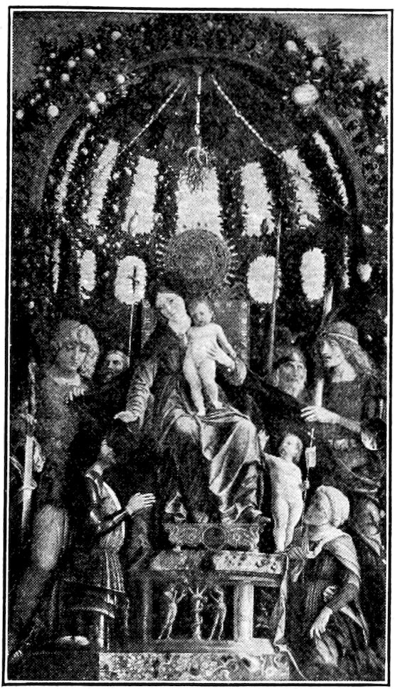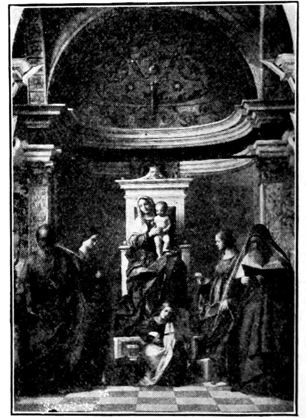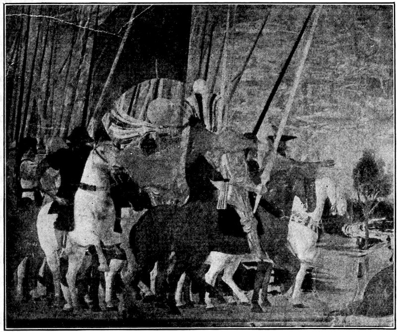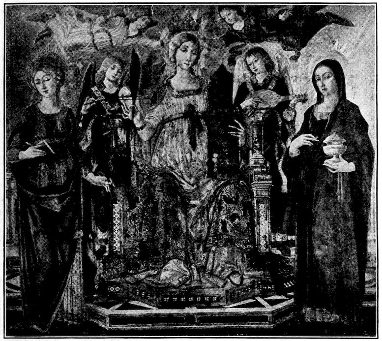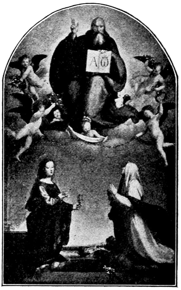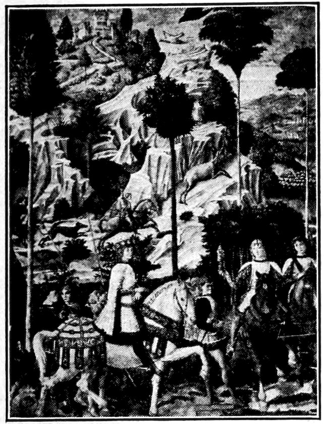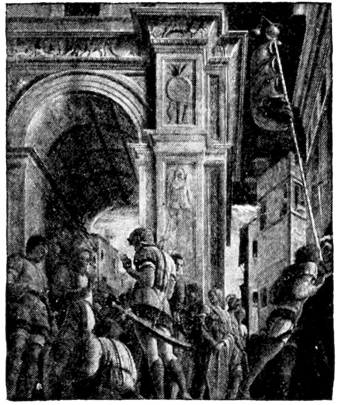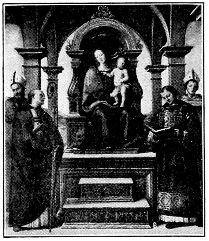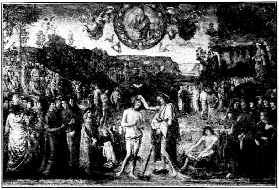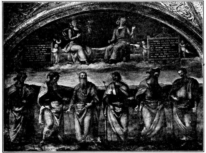 So much for the shop methods. Now for him who makes shops possible—the patron. A wealthy Florentine as naturally wanted to invest in a frescoed chapel as a wealthy American 7does in a fleet of motor cars. Considering the changed value of money, one indulgence was about as costly as the other. But the Florentine never quite regarded paintings as luxuries. They were necessary to him. He loved them. They enhanced his prestige in this world and improved his chances in the next. Then to beautify a church was really to magnify the liberty and prosperity of Florence, which largely derived from the Holy See. Recall that every Florentine was born a Catholic, baptized in the fair Church of St. John with the name of a saint. This saint, he believed, could aid him morally and materially, was in every sense his celestial patron. It paid to do the saint honor, and that could best be done through the painter’s art. The poorest man might have a small portrait of his patron, a rich man might endow a chapel and cause all his patron’s miracles to be pictured on the wall. Think also that every altar—a dozen or more in every large church—was a shrine[1], containing the bread and wine that by the never-ceasing miracle of the Mass became the Saviour’s body and blood; and was also a reliquary or tomb, containing in whole or part the body of some saint. Every altar then, and every chapel inclosing one, cried out for a twofold interpretation of its meaning. Everything about the Eucharist had to be explained (involving pretty nearly all of Biblical history), and the particular relic required similar illumination. Since many of the faithful could not read, and the Catholic Church has ever been merciful as regards sermonizing, these explanations of the altar as miracle shrine of Our Lord and as tomb of a particular saint were best made pictorially, and generally were so made.