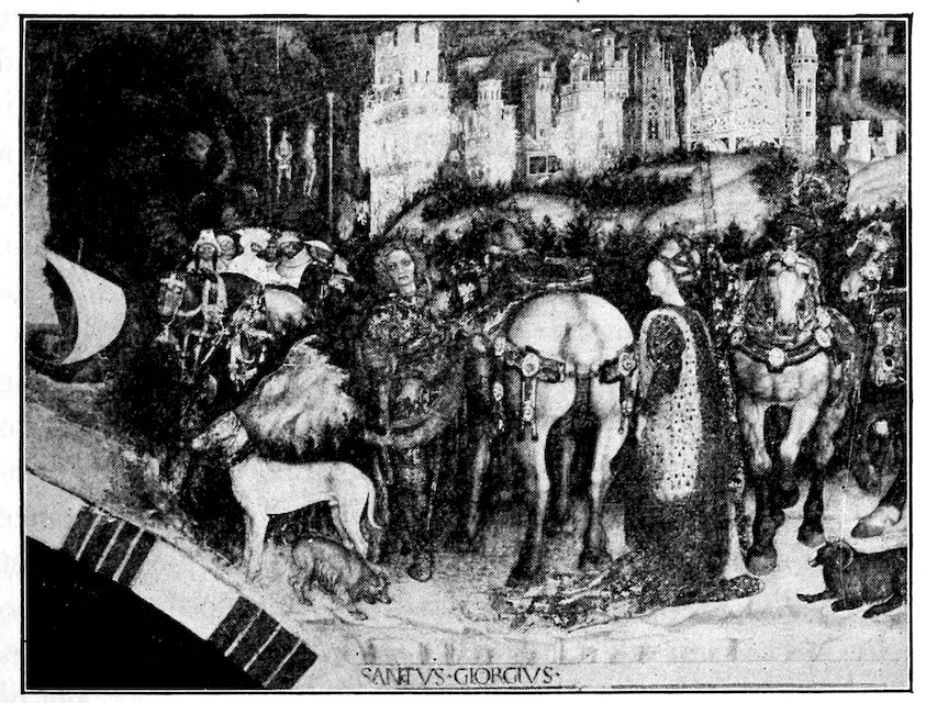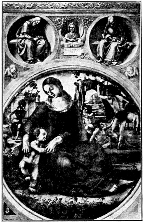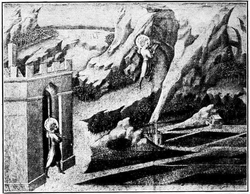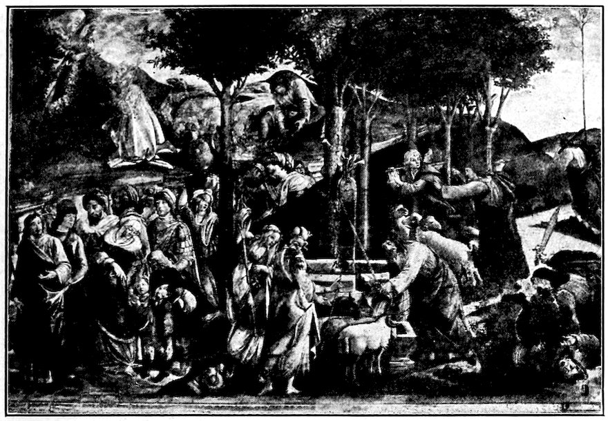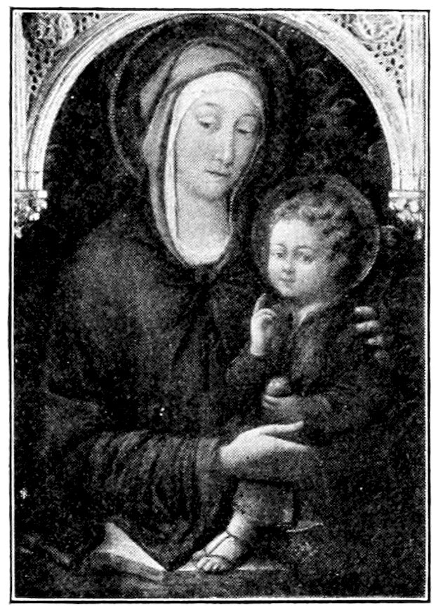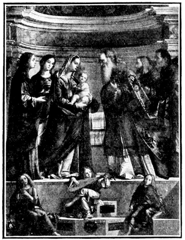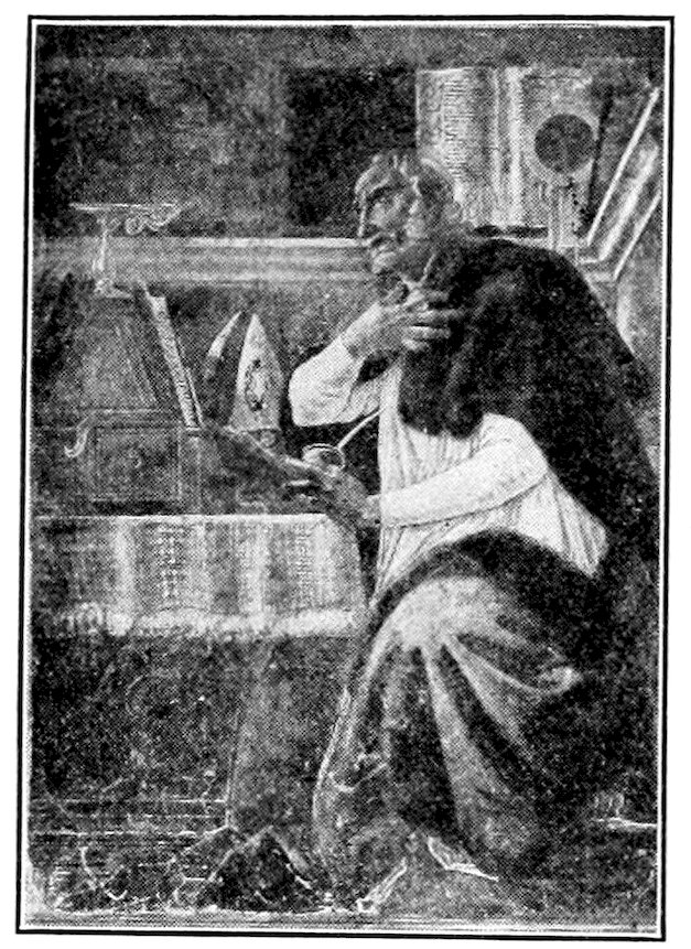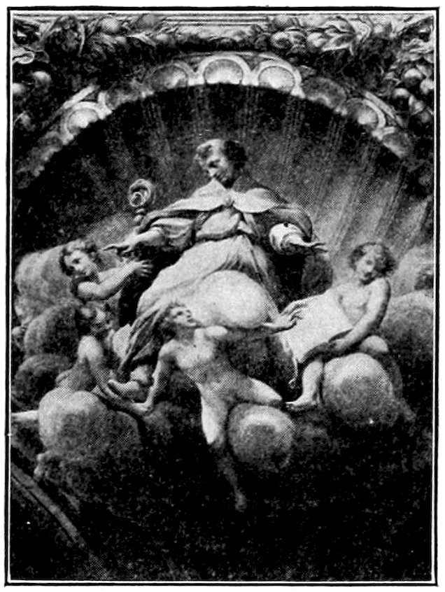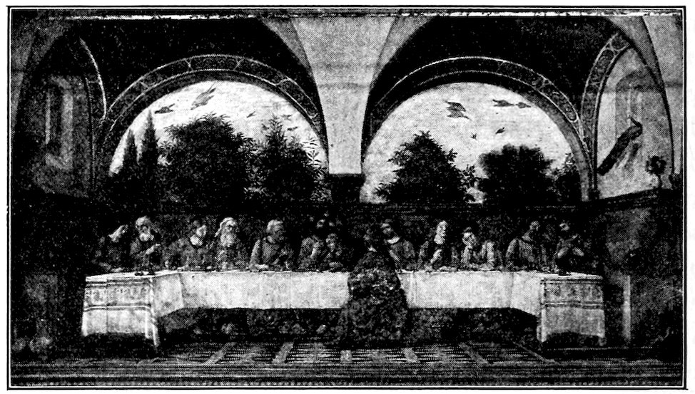 So much for the shop methods. Now for him who makes shops possible—the patron. A wealthy Florentine as naturally wanted to invest in a frescoed chapel as a wealthy American 7does in a fleet of motor cars. Considering the changed value of money, one indulgence was about as costly as the other. But the Florentine never quite regarded paintings as luxuries. They were necessary to him. He loved them. They enhanced his prestige in this world and improved his chances in the next. Then to beautify a church was really to magnify the liberty and prosperity of Florence, which largely derived from the Holy See. Recall that every Florentine was born a Catholic, baptized in the fair Church of St. John with the name of a saint. This saint, he believed, could aid him morally and materially, was in every sense his celestial patron. It paid to do the saint honor, and that could best be done through the painter’s art. The poorest man might have a small portrait of his patron, a rich man might endow a chapel and cause all his patron’s miracles to be pictured on the wall. Think also that every altar—a dozen or more in every large church—was a shrine[1], containing the bread and wine that by the never-ceasing miracle of the Mass became the Saviour’s body and blood; and was also a reliquary or tomb, containing in whole or part the body of some saint. Every altar then, and every chapel inclosing one, cried out for a twofold interpretation of its meaning. Everything about the Eucharist had to be explained (involving pretty nearly all of Biblical history), and the particular relic required similar illumination. Since many of the faithful could not read, and the Catholic Church has ever been merciful as regards sermonizing, these explanations of the altar as miracle shrine of Our Lord and as tomb of a particular saint were best made pictorially, and generally were so made.