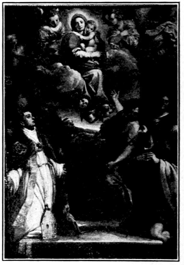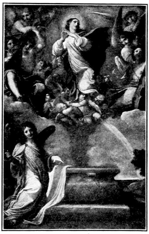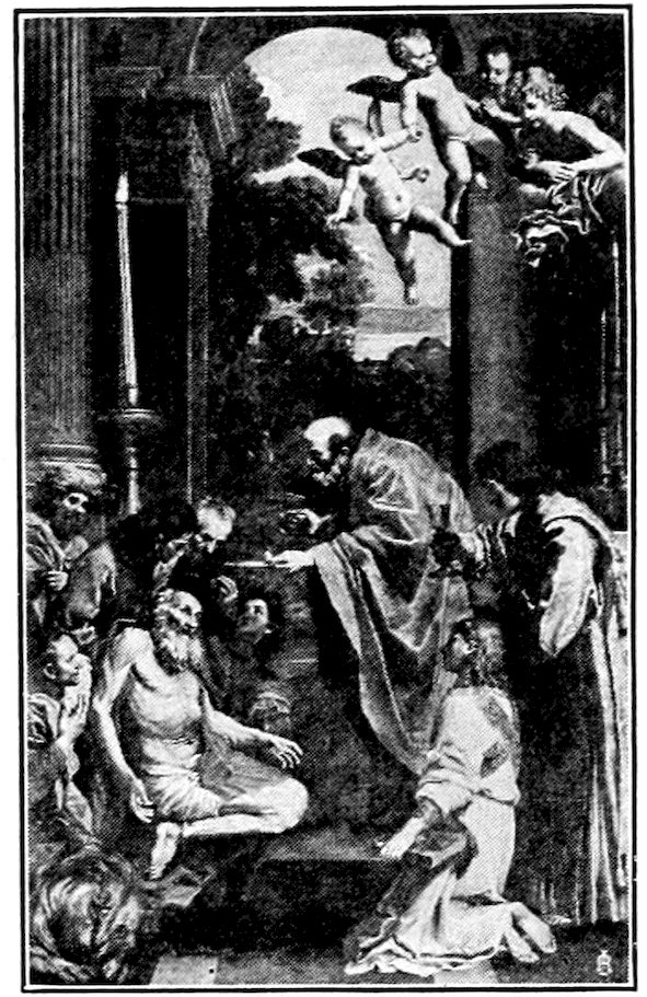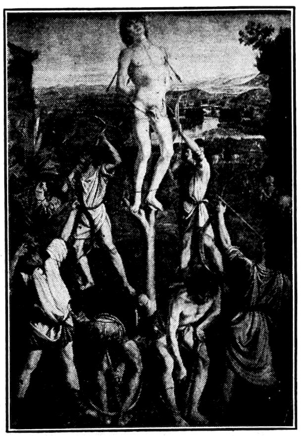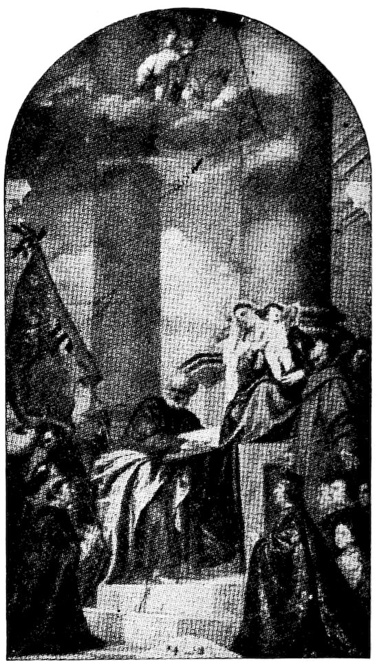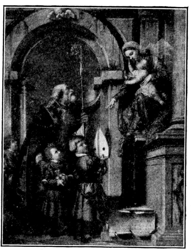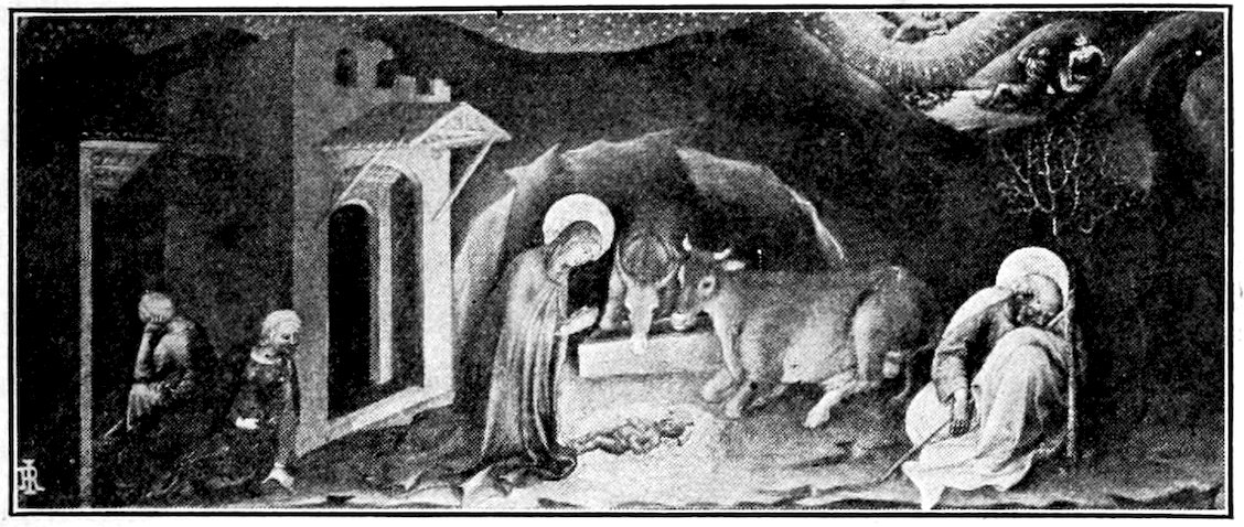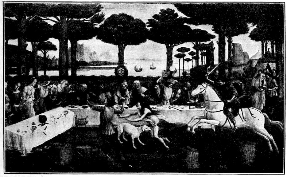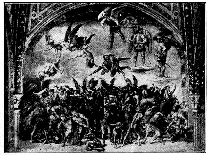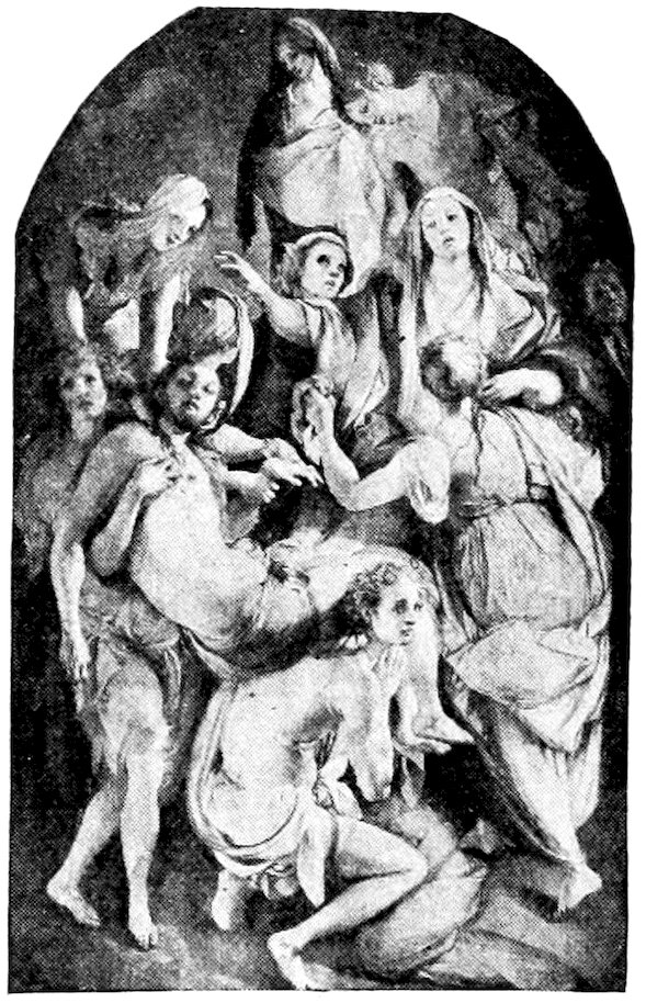 So much for the shop methods. Now for him who makes shops possible—the patron. A wealthy Florentine as naturally wanted to invest in a frescoed chapel as a wealthy American 7does in a fleet of motor cars. Considering the changed value of money, one indulgence was about as costly as the other. But the Florentine never quite regarded paintings as luxuries. They were necessary to him. He loved them. They enhanced his prestige in this world and improved his chances in the next. Then to beautify a church was really to magnify the liberty and prosperity of Florence, which largely derived from the Holy See. Recall that every Florentine was born a Catholic, baptized in the fair Church of St. John with the name of a saint. This saint, he believed, could aid him morally and materially, was in every sense his celestial patron. It paid to do the saint honor, and that could best be done through the painter’s art. The poorest man might have a small portrait of his patron, a rich man might endow a chapel and cause all his patron’s miracles to be pictured on the wall. Think also that every altar—a dozen or more in every large church—was a shrine[1], containing the bread and wine that by the never-ceasing miracle of the Mass became the Saviour’s body and blood; and was also a reliquary or tomb, containing in whole or part the body of some saint. Every altar then, and every chapel inclosing one, cried out for a twofold interpretation of its meaning. Everything about the Eucharist had to be explained (involving pretty nearly all of Biblical history), and the particular relic required similar illumination. Since many of the faithful could not read, and the Catholic Church has ever been merciful as regards sermonizing, these explanations of the altar as miracle shrine of Our Lord and as tomb of a particular saint were best made pictorially, and generally were so made.