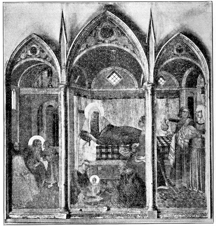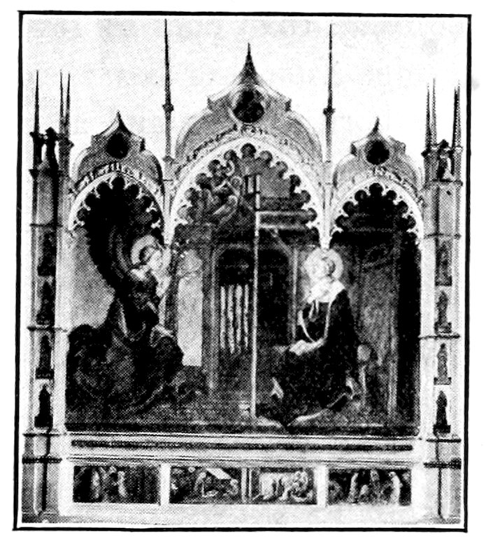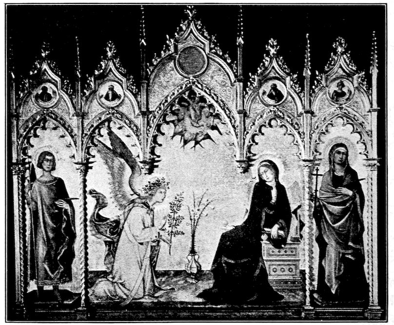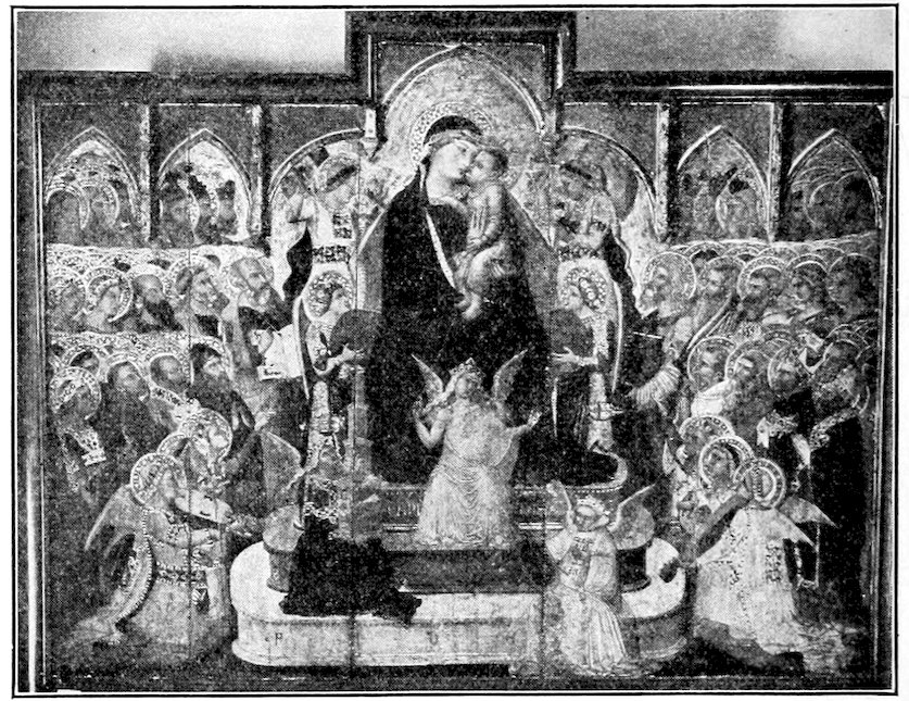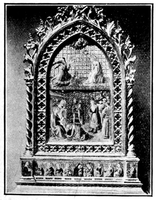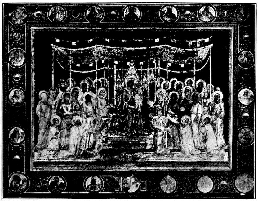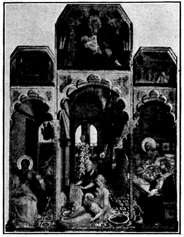 These two methods set distinct limits to the work and its effects. The colors were ground up day by day in the shop. Each had its little pot. There was no palette. Hence only a few colors were used, and with little mixing. For tempera painting a good wooden panel—preferably of poplar—was grounded with successive coats of finest plaster of Paris in glue and rubbed down to ivory smoothness. The composition was then copied in minutely from a working drawing. The gold background inherited from the workers in mosaic was laid on in pure leaf. The composition was first lightly shaded and modelled either in green or brown earth, and then finished up a bit at a time, in colors tempered with egg or vegetable albumen. The paints were thick and could not be swiftly manipulated; the whole surface set and so hardened that retouching was difficult. How so niggling a method produced so broad and harmonious effects will seem a mystery to the modern artist. It was due to system and sacrifice. Though the work was done piecemeal, everything was thought out in advance. Dark shadows and accidents of lighting which would mar the general blond effect were ignored. The beauty desired was not that of nature, but that of enamels and semi-precious stones. These panels are glorious in azures, cinnabars, crimsons, emerald-greens, and whites partaking of all of these hues. 6Their delicacy is enhanced by carved frames, at this moment, 1300, simply gabled and moulded; later built up and arched and fretted with the most fantastic gothic features.