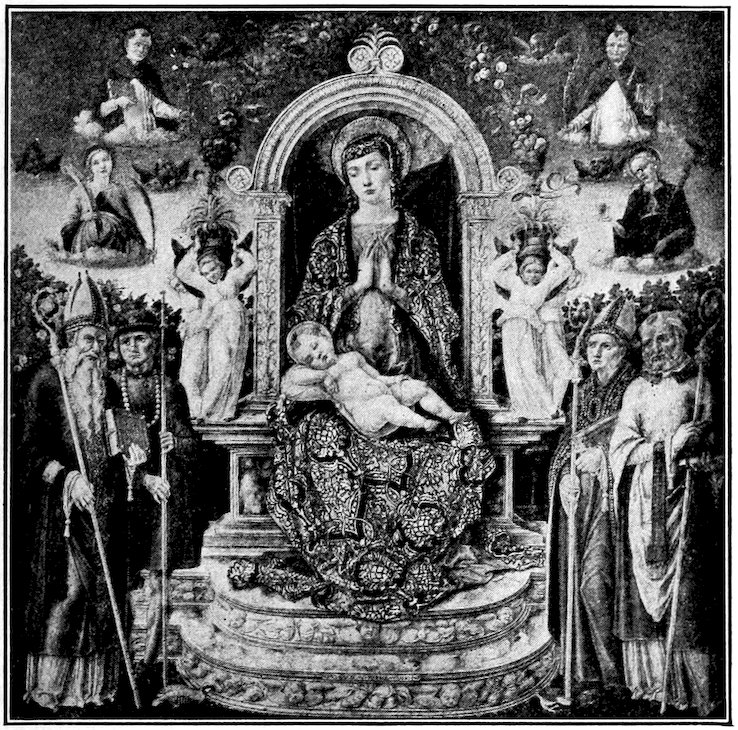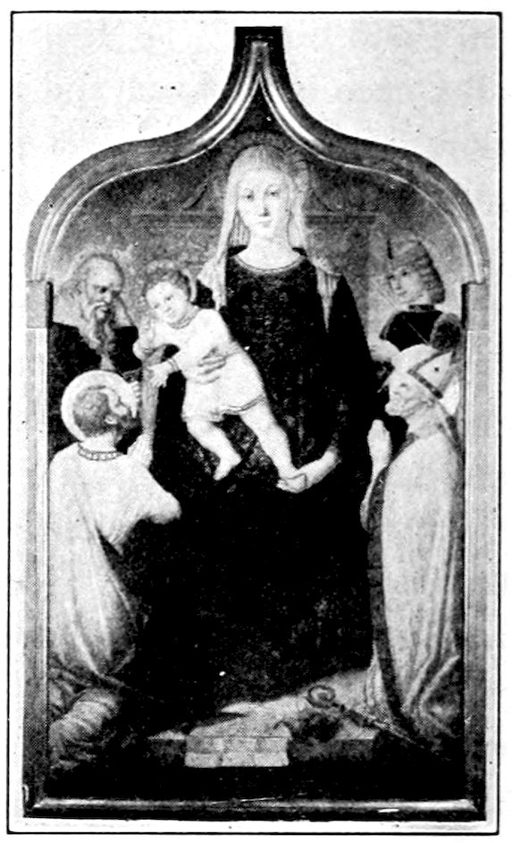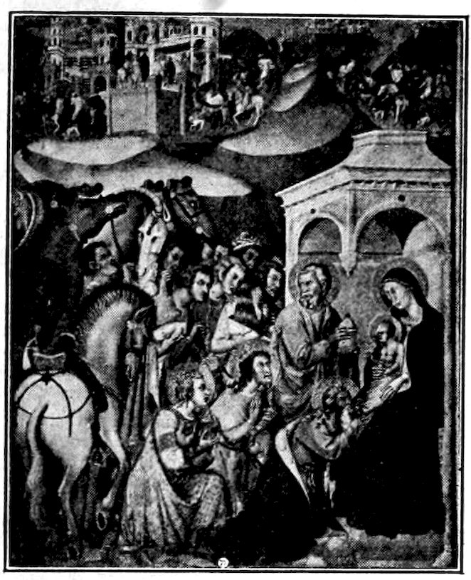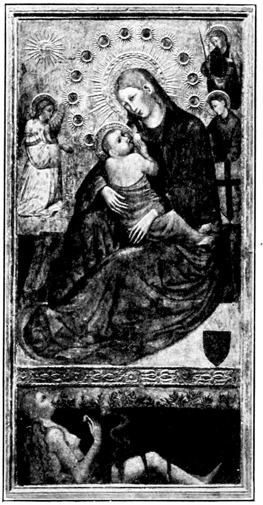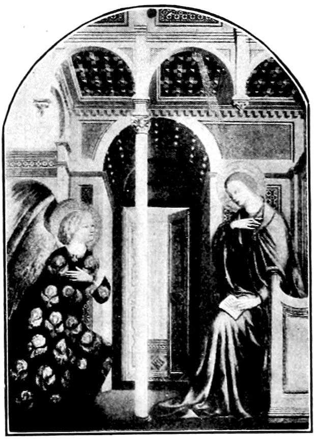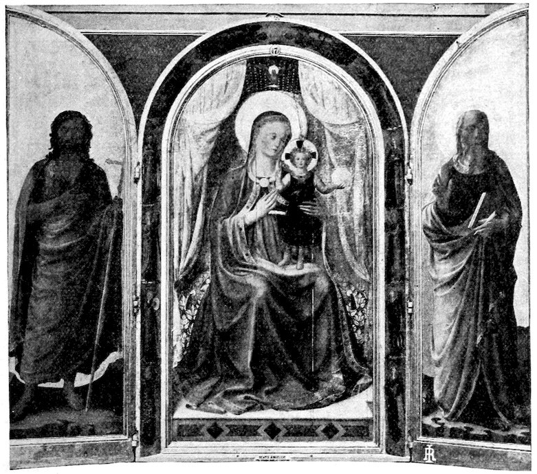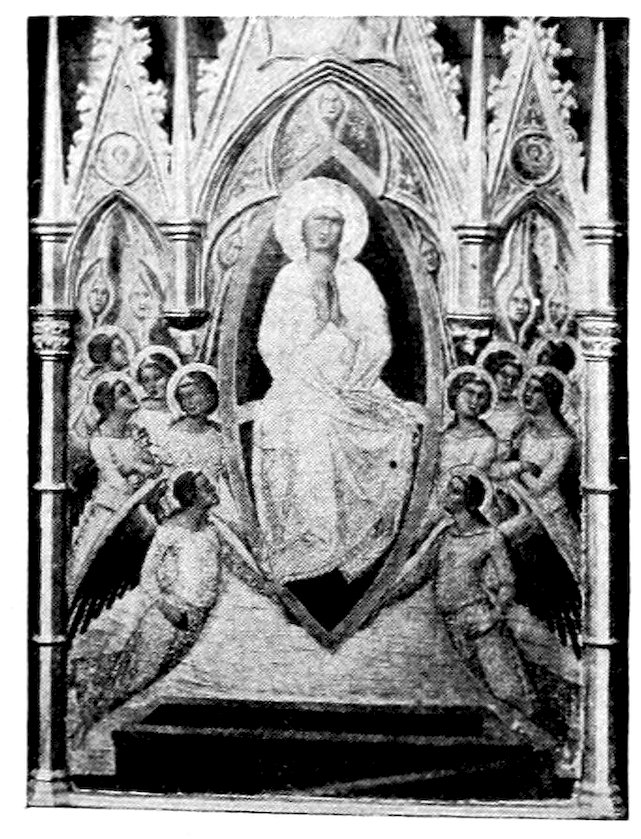 These two methods set distinct limits to the work and its effects. The colors were ground up day by day in the shop. Each had its little pot. There was no palette. Hence only a few colors were used, and with little mixing. For tempera painting a good wooden panel—preferably of poplar—was grounded with successive coats of finest plaster of Paris in glue and rubbed down to ivory smoothness. The composition was then copied in minutely from a working drawing. The gold background inherited from the workers in mosaic was laid on in pure leaf. The composition was first lightly shaded and modelled either in green or brown earth, and then finished up a bit at a time, in colors tempered with egg or vegetable albumen. The paints were thick and could not be swiftly manipulated; the whole surface set and so hardened that retouching was difficult. How so niggling a method produced so broad and harmonious effects will seem a mystery to the modern artist. It was due to system and sacrifice. Though the work was done piecemeal, everything was thought out in advance. Dark shadows and accidents of lighting which would mar the general blond effect were ignored. The beauty desired was not that of nature, but that of enamels and semi-precious stones. These panels are glorious in azures, cinnabars, crimsons, emerald-greens, and whites partaking of all of these hues. 6Their delicacy is enhanced by carved frames, at this moment, 1300, simply gabled and moulded; later built up and arched and fretted with the most fantastic gothic features.