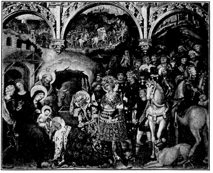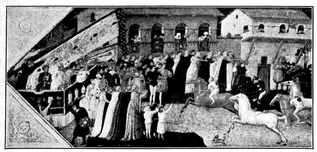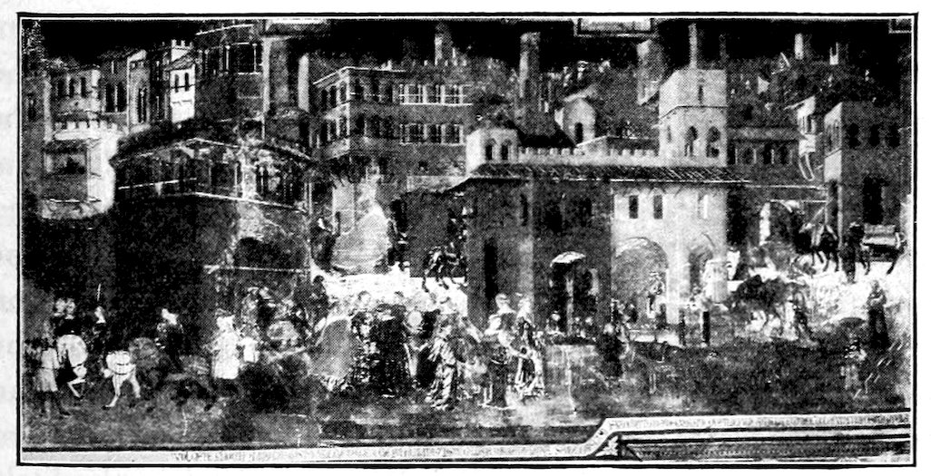 Giotto left many followers,[12] not one of whom at all understood his greatness. Like his friend Dante, he was distantly admired, but really loved only in bits. As perceptive a person as the artist biographer Vasari lavishes praise upon Giotto for his more trivial inventions—the Christ Child struggling out of the arms of the High Priest, for example. So Giotto’s followers picked unintelligently from his great accomplishment, choosing what the master himself would least have valued—his simple contours without his significant mass, his variety and vivacity without his warmth and restraint. On their own account they added complication. The sparse economy of Giotto’s best work could never have appealed to Florence at large. Something richer and gayer was wanted, more like Florentine life itself as it became after the general loosening up of manners and morals following the plague of 1348. Its chronicler, the author of the “Decameron,” fairly represents the new spirit. The best of the younger painters have indeed something of Boccaccio’s mentality—his light touch, his charm, his panoramic richness, his fluid and undisciplined grace. Thus arises what I may call the panoramic style of fresco painting—superficial, full of episodes and accessories, still religious in theme, but mundane in spirit, often cleverly conceived, and very superficially felt. These artists had grasped neither the meaning of Giotto’s drawing nor the beauty of his decorative formulas, they saw only his variety and energy. Meanwhile a great Sienese painter, Ambrogio Lorenzetti, a profound admirer of Giotto, had worked out a nobly spectacular form of painting in which the stage setting was elaborate and realistic. He painted much in Florence 43about 1334 and his novelties allured the new men. So we find fresco painting tending in a scenic direction, and panel painting following the same course more conservatively—not merely in Florence and Siena, but throughout Northern Italy as well.