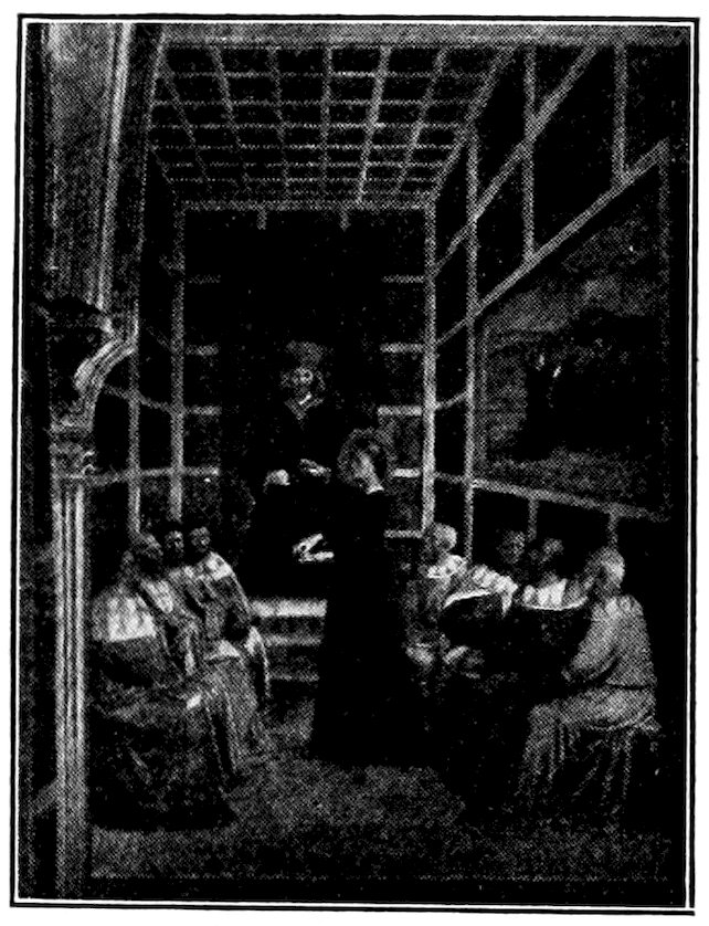 If the painter in tempera required chiefly patience and delicacy, the painter in fresco must have resolution and audacity. He must calculate each day’s work exactly, and a whole day’s work could be spoiled by a single slip of the hand in the tired evening hour. For fresco, the working sketch was roughly copied in outline on a plaster wall. Then any part selected for a day’s work was covered with a new coat of fine plaster. The effaced part of the design must be rapidly redrawn on the wet ground. Then the colors were laid on from their little pots, and only the sound mineral colors which resist lime could be employed. The vehicle was simply water. The colors were sucked deep into the wet plaster, and united with it to form a surface as durable as the wall itself. Generally the colors were merely divided into three values,—light, pure colors, and dark. Everything was kept clear, rather flat, and blond, highly simple and beautifully decorative. One of the later painters, Cennino Cennini (active about 1400), tells us that a single head was a day’s work for a good frescante. The touch had to be sure, for a mis-stroke meant scraping the wet plaster off, relaying it, and starting all over again. The fresco painter accordingly needed discipline and method. Nothing could be farther from modern inspirational methods. Where everything was systematized and calculated in advance, you will see it was quite safe for a master to entrust his designs to pupils who knew his wishes. Every fresco when dry was more or less retouched in tempera, but the best artists did this sparingly, knowing that the retouches would soon blacken badly or flake off.