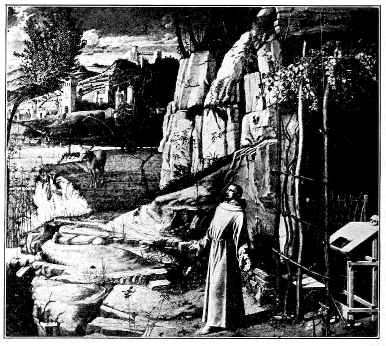 In the adjoining chapel of the Bardi family, Giotto, a little later, I believe, painted six stories of St. Francis, and four figures of the great Franciscan saints, St. Louis of France, St. Louis of Toulouse, St. Clare, and St. Elizabeth of Hungary. Over the entrance arch he set an animated picture of St. Francis receiving the stigmata, the wounds of the Saviour. Nearly thirty years earlier he had done this subject for the Church at Assisi, and in an altar-piece which has passed from Pisa to the Louvre. By comparing the rigid, angular figures of the earlier composition and their ill-adjusted accessories, with this easy and beautifully balanced arrangement, you may see how far Giotto had gone in the direction of grace, and you will not fail also to note how much more tragic the earlier and less calculated work is.