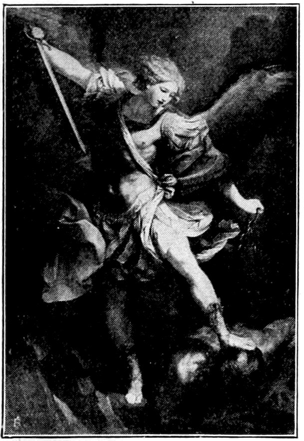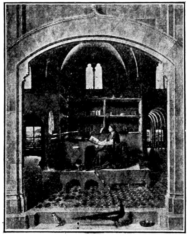 The first impression of a visitor to the chapel will be a feeling of awe qualified by joy in the loveliest of colors. The whites of the classical draperies dominate. They are shot with rose, or pale blue, or grey green. Certain old enamels have the same quality of making the most splendid crimsons, blues, and greens seem merely foils to foreground masses of white which seem to include by implication all the positive colors. It is this bright and original color scheme balancing crimsons and azures with violets and greens which makes a 26thing of beauty out of what would otherwise be a stilted checkerboard arrangement.