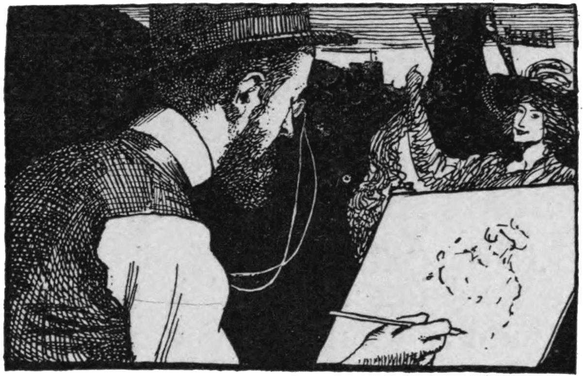Forain is yet another past habitué of the Montmartre “Café des Hydropathes” (which later developed into the “Chat Noir”) who has achieved fame and riches. He now lives in a splendid mansion in one of the most fashionable quarters of Paris, immersed as ever in his studies, and taking up sculpture as a relaxation. He works in a vast, untidy studio amidst an astounding litter of studies and papers, from which he but occasionally tears himself for a rapid spin in his beloved motor-car.