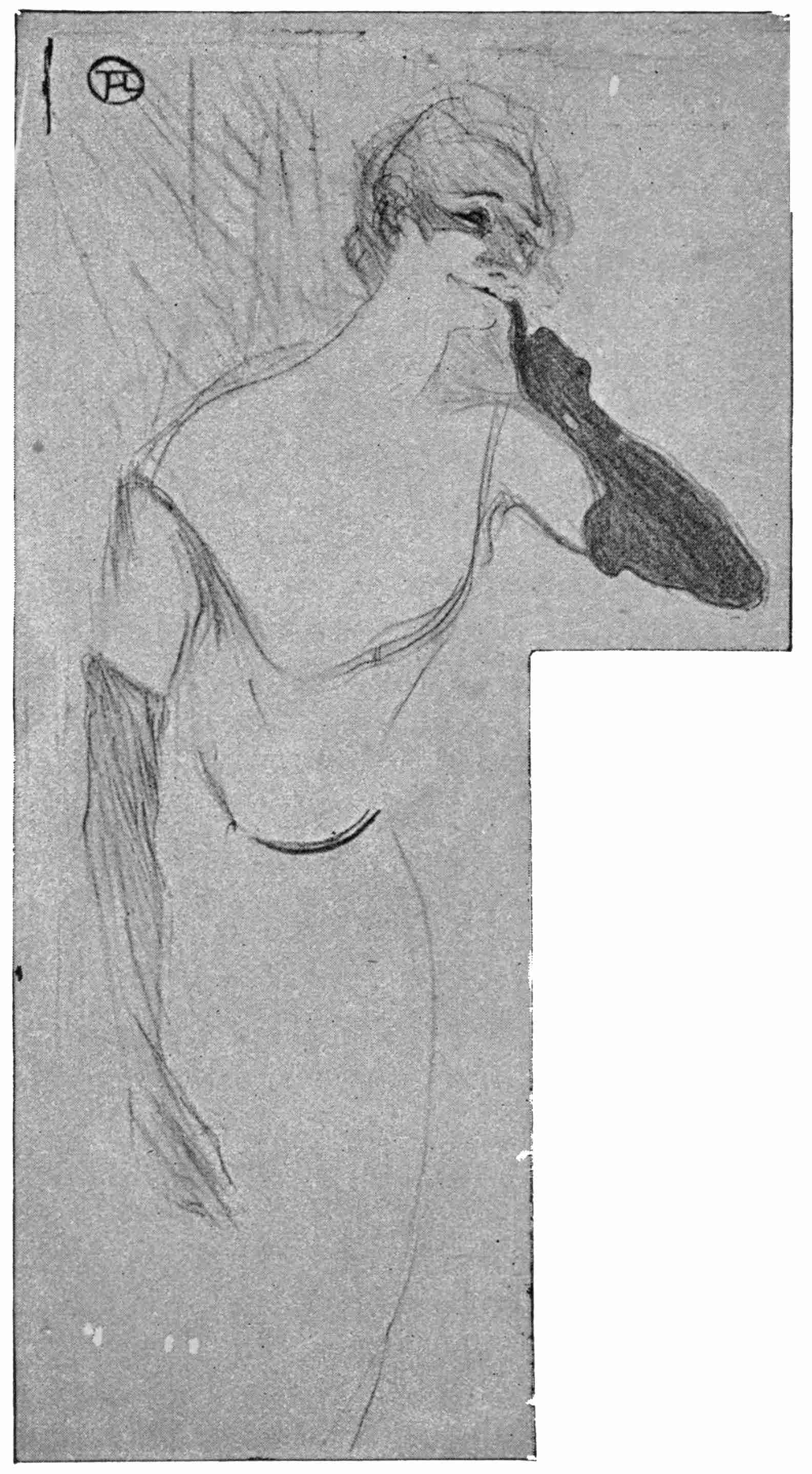 The number of L’Album devoted to Forain contains able sketches, done in wash and chalk, which are stronger in effect, although incomplete looking; and bear the impress of having been dashed off at great speed while the inspiration lasted. A very subtle drawing of the nude, entitled, The Tub, however, is included in the number, as well as some strongly indicated work in colour.