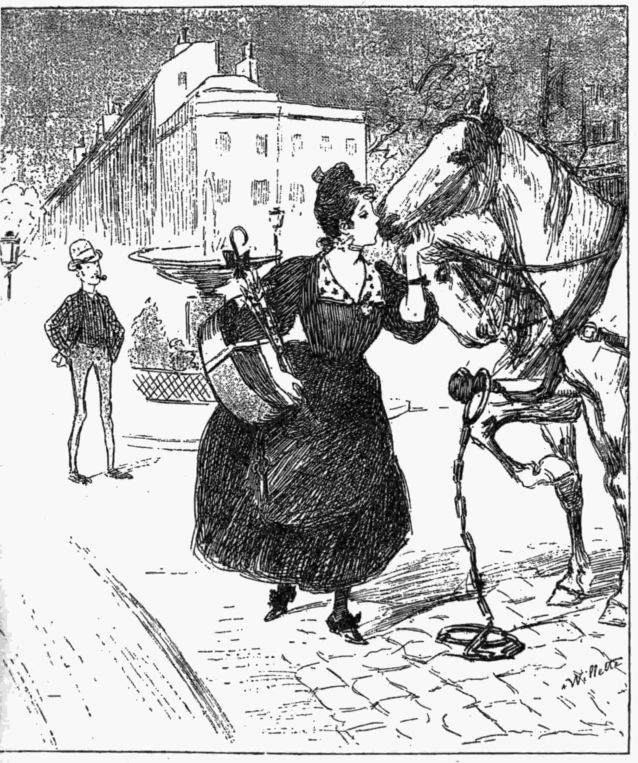 These drawings are almost all executed with a thin, pin-point pen line, of even thickness throughout, and with flat tones of shading added by means of mechanically engraved dots. Forain, Vogel, and Willette, although their methods differ, are among the few70 who now illustrate with such faint lines and aim at such fragile effects.
