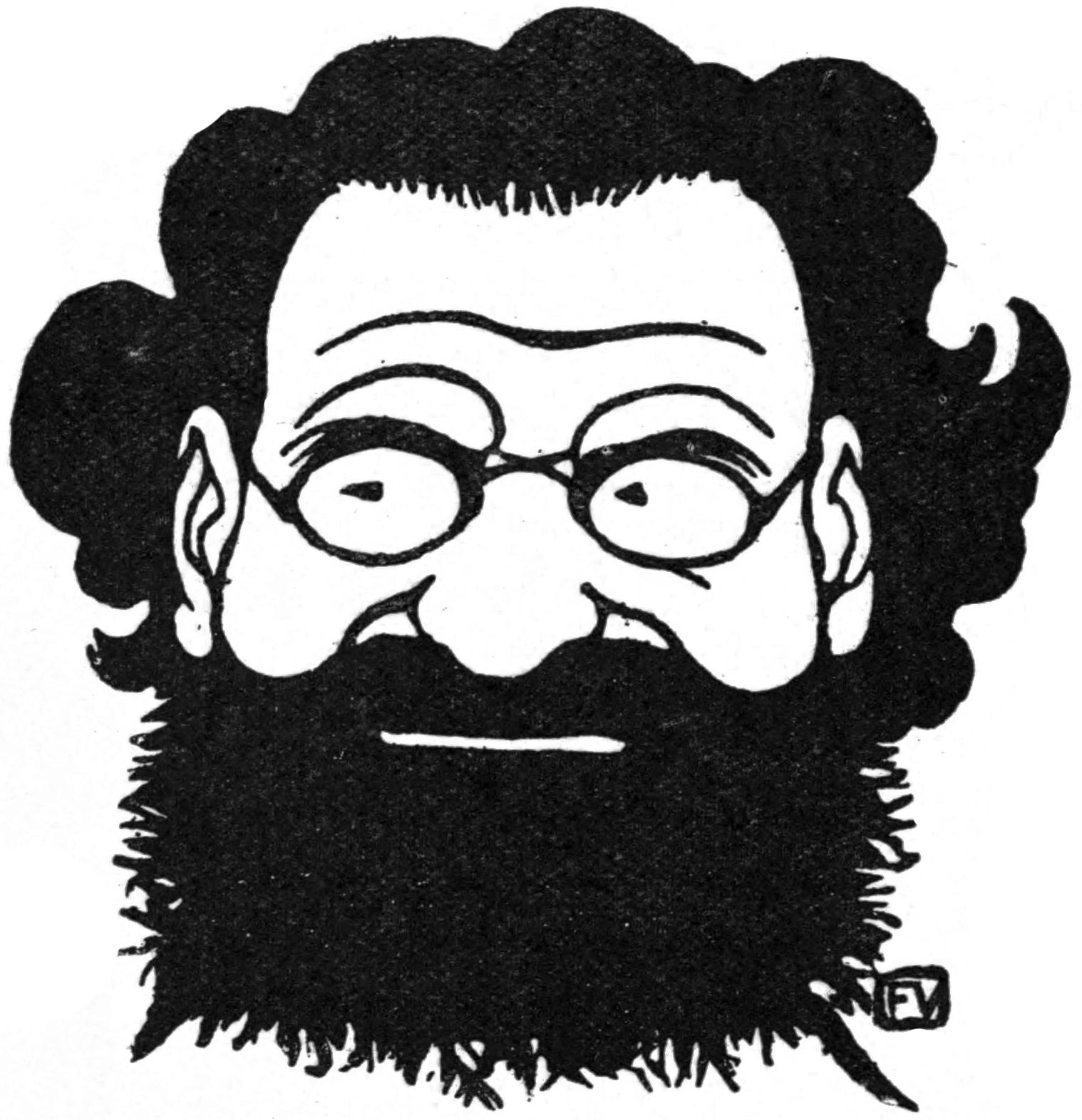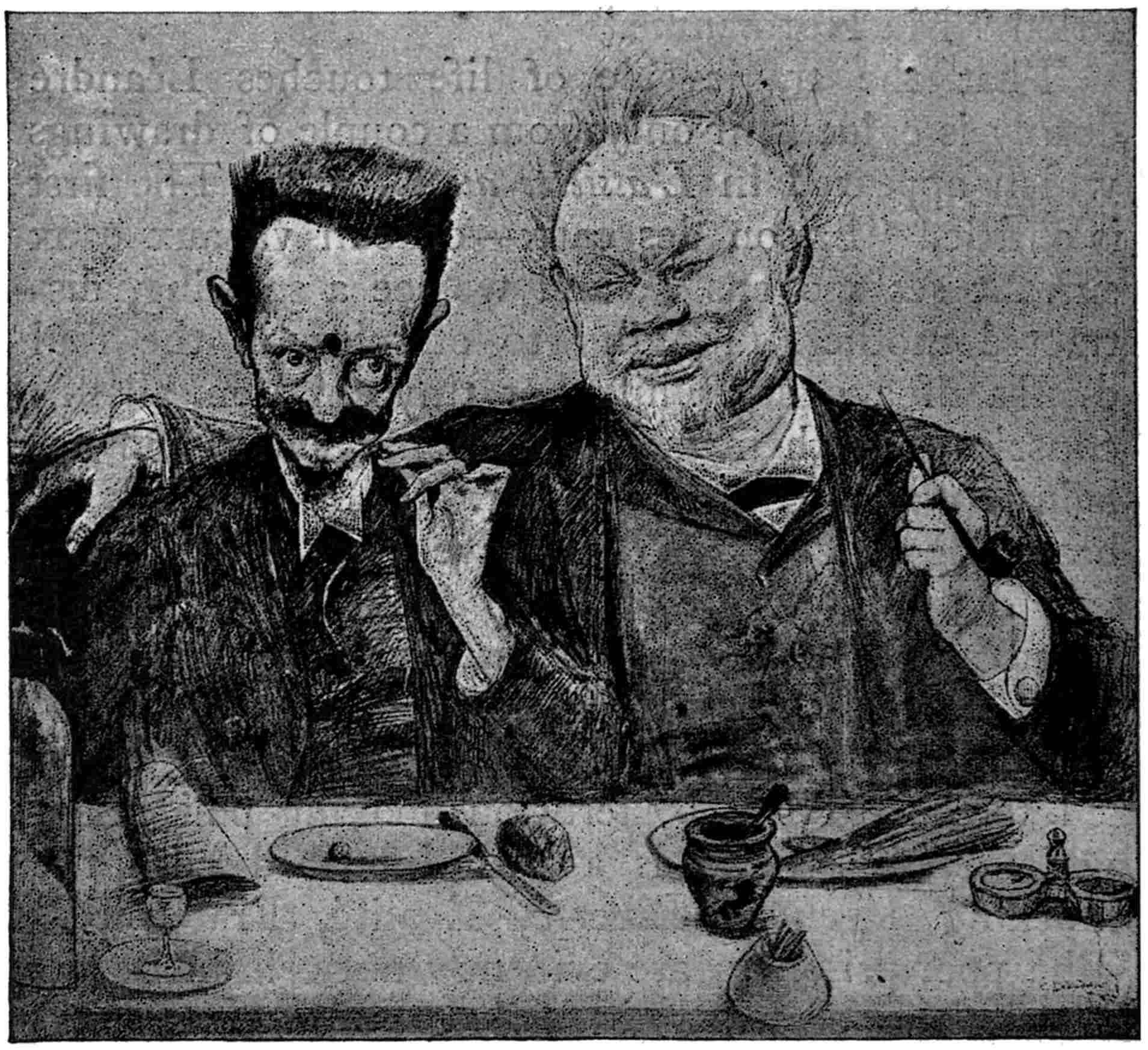 Léandre has frequently introduced a self-portrait into his sketches, and he is evidently as critical of himself as of others. He always shows us a serio-comic little man with chubby cheeks, bulging, spectacled eyes, and a big inquisitive nose dominating a small turned-up moustache and starveling beard. Some of his own military service adventures he has depicted for us in mock heroic style in “Les Treize Jours de Léandre.” Among notable caricature portraits is that of Drumont, the arch Jew-baiter. In a coloured drawing entitled “The Ogre’s Repast,” we see this noisome person with a chain of Semite “portions” round his neck poising a gory80 Jewish head on his fork previous to making a meal of it. In fine irony a cross hangs on his breast.