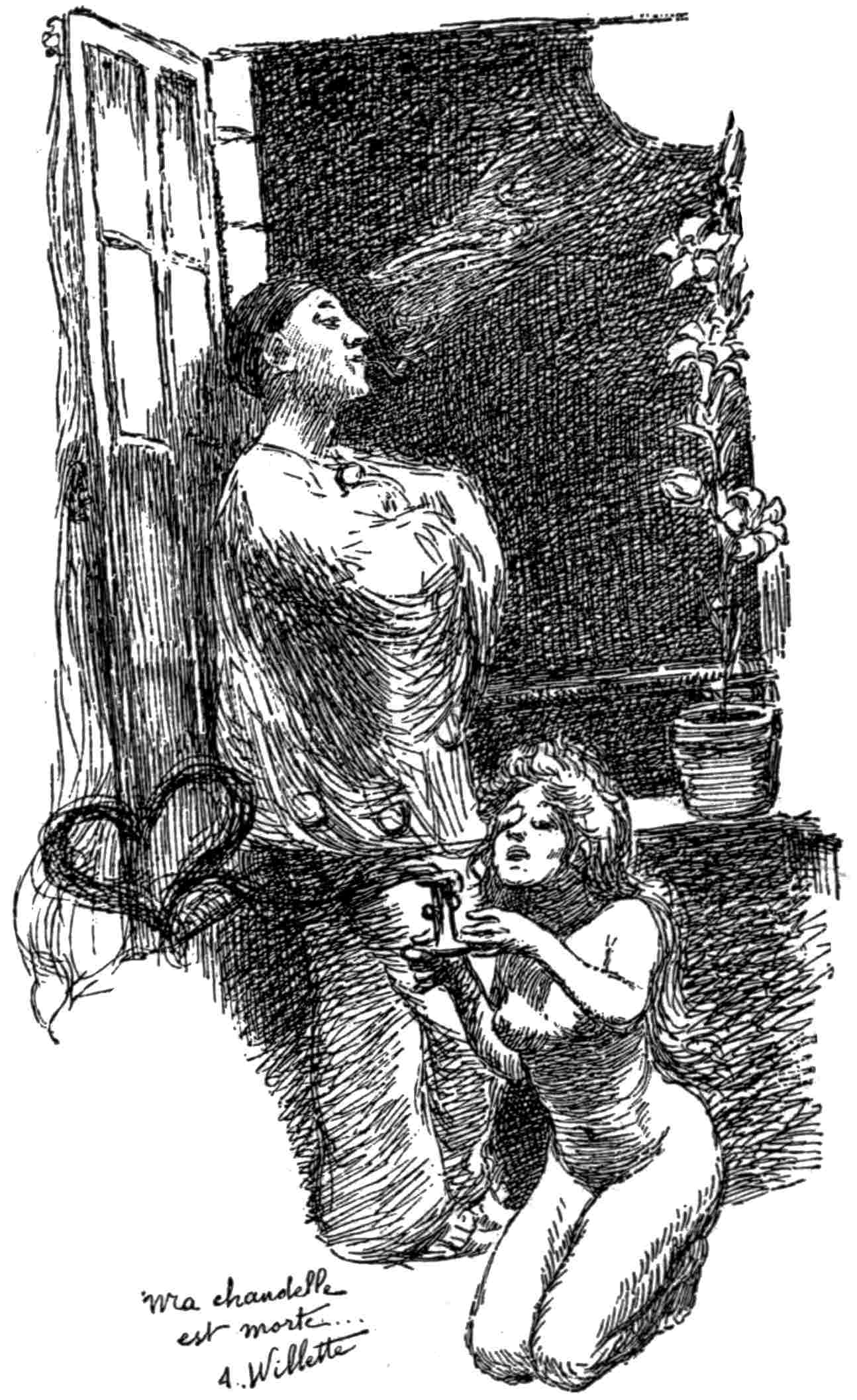 An astounding drawing of a bacchanalian orgy entitled Ribote de Noël appeared in No. 112 of Le Rire, and the whole reeling scene of drunken revelry is marvellously rendered. In the largeness of the forms and the rollicking abandon of the whole scene we are reminded of our own Rowlandson, an artist whose work is thoroughly appreciated across the Channel. The quintessence of quaintness is reached in another drawing, which again reminds us somewhat of Rowlandson. It is a drawing contained in L’Album, entitled “La Folie des Grandeurs—Les Yeux plus grands que le Ventre”; and shows us a queer little Tom Thumb of a man smoking a cigar, and speaking in the language of the eye volumes of admiration for the mountainous woman against whose knee he lolls.