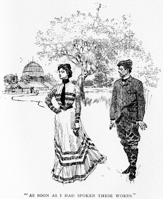 I was beginning to move more rapidly along the little path, well worn by many rubber tires, which edged the broad roadway, when I perceived the doctor's daughter standing at the gate of her father's front yard. As I knew her very well, and she happened to be standing there and looking in my direction, I felt that it would be the proper thing for me to stop and speak to her, and so I dismounted and proceeded to roll my bicycle up to the gate.
