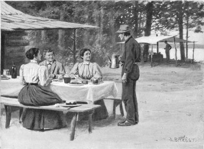 “My dear Harriet,” said Mrs. Dearborn, “if you are at Sadler’s, you can go into any sort of camp you please. I will tell you all about Sadler’s. Sadler is a man of progress. His hotel or inn is on the very edge of the forest country, and away from all the centres of resort. He calls his place the terminal link of public travel in that direction. When you leave him you travel privately in any 11 way you like. He has established what he has named a bureau of camping, and he furnishes his patrons with any sort of a camp they may desire. If the party is few in number and of a timid disposition, they can have a camp within shouting distance of his house. If they are brave and adventurous, he will send them out into the depths of the forest. If they like water, he locates them by the shores of a lake. If climbing is their passion, he puts them at the foot of a mountain. Those who want to hunt can do so, and those who dislike fire-arms are placed in a camp where the popping of guns is never heard. He provides tents, guides, provisions, and even dangers and sensations.”