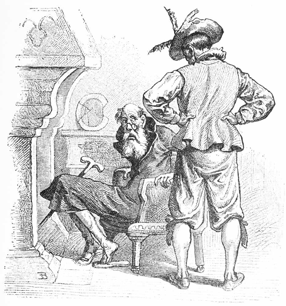 In a large inner hall, sitting before a great fire, they saw a giant so tall and thin that he looked as if he had been made of great fishing-poles. He turned uneasily in his chair when he saw his visitor, and was going to say something about being too unwell to receive company, when our young giant,[Pg 34] whose name was Feldar, interrupted him by calling out, in a tremendous voice: