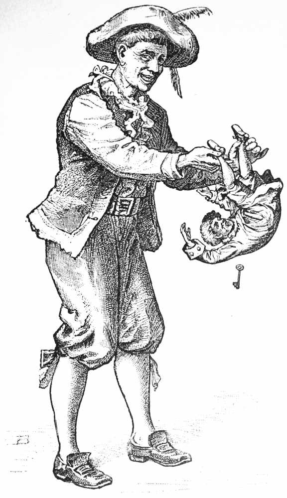 The giant made no answer, but taking the dividing-agent by the heels, he held him upside down in[Pg 44] the air, and shook him. A big key dropped from his pockets.