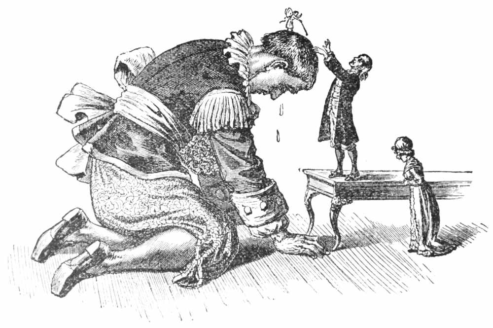 “Indeed I should,” was the reply. Then the young giant kneeled on the floor; and the Count got up on a table, and put his hands on the young giant’s head, and adopted him.